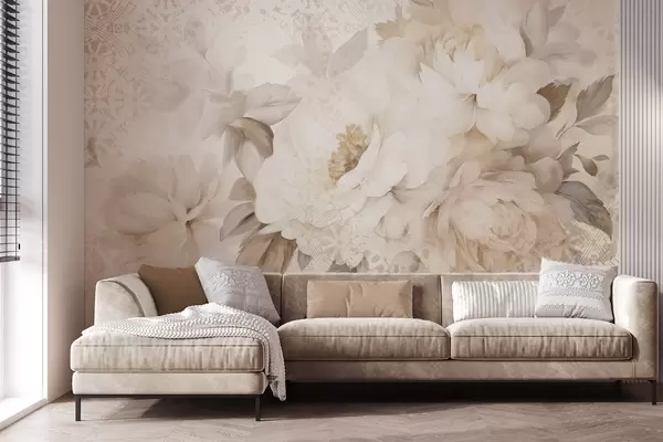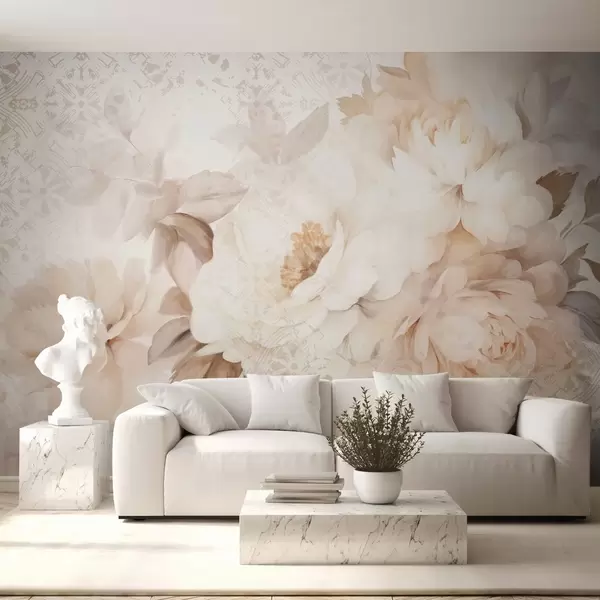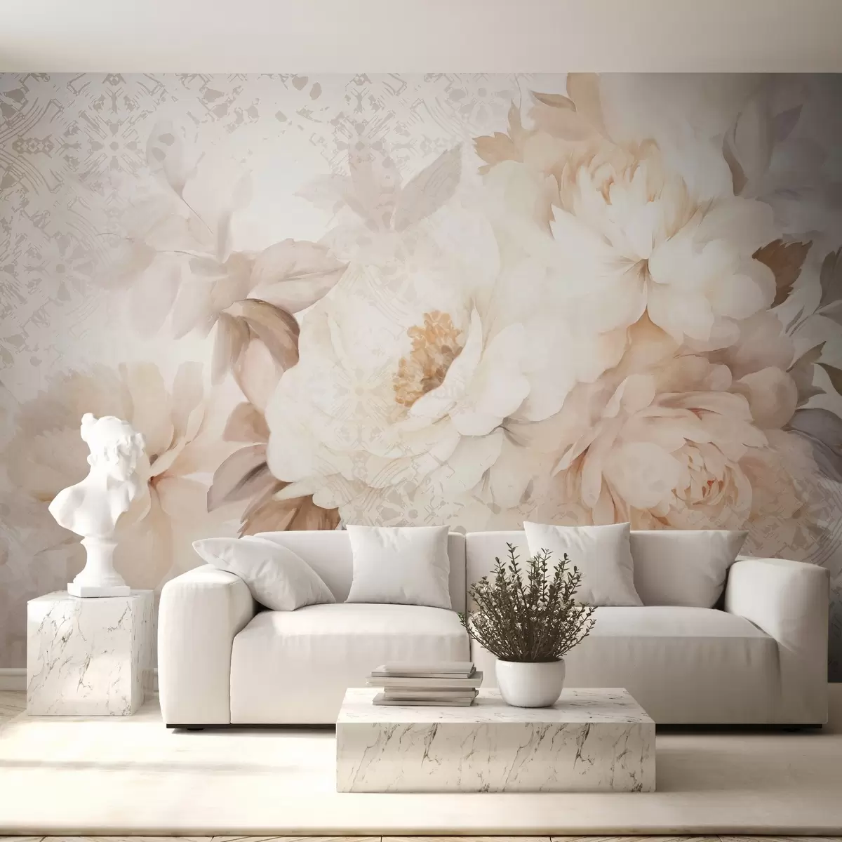 murais de parede Um arranjo floral de peónias brancas com folhas bege, sobre um fundo decorativo com uma textura vintage w09345