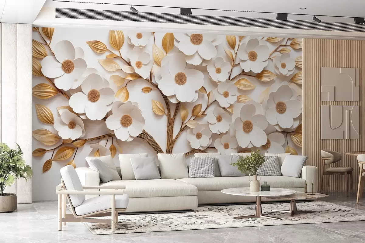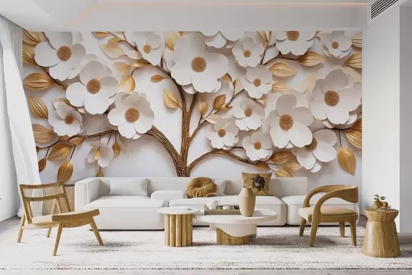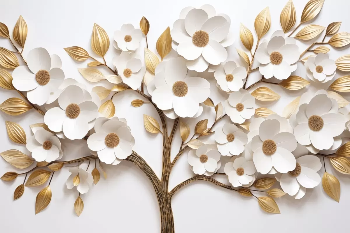 Murais de parede Árvore com flores brancas e imitação de folhas em relevo Nr. w09348