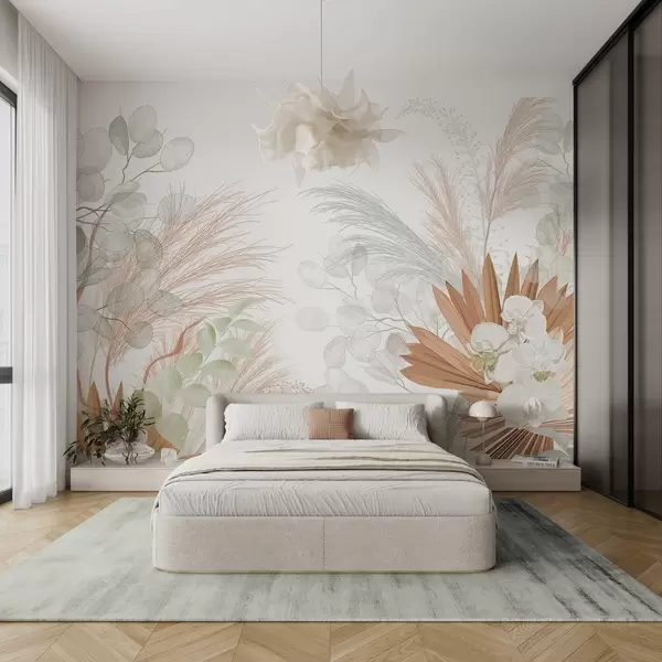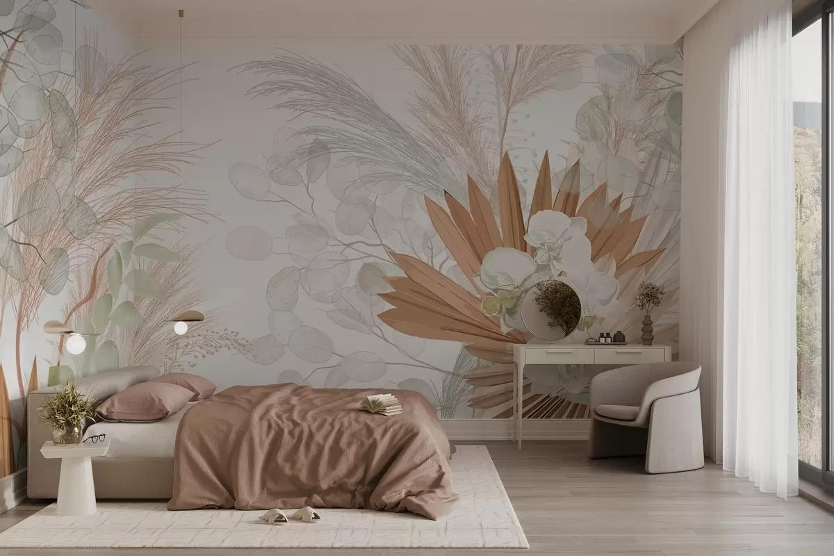 Murais de parede Capim-dos-pampas, eucalipto, folhas tropicais e orquídeas em fundo branco, cores pastel Nr. w09366