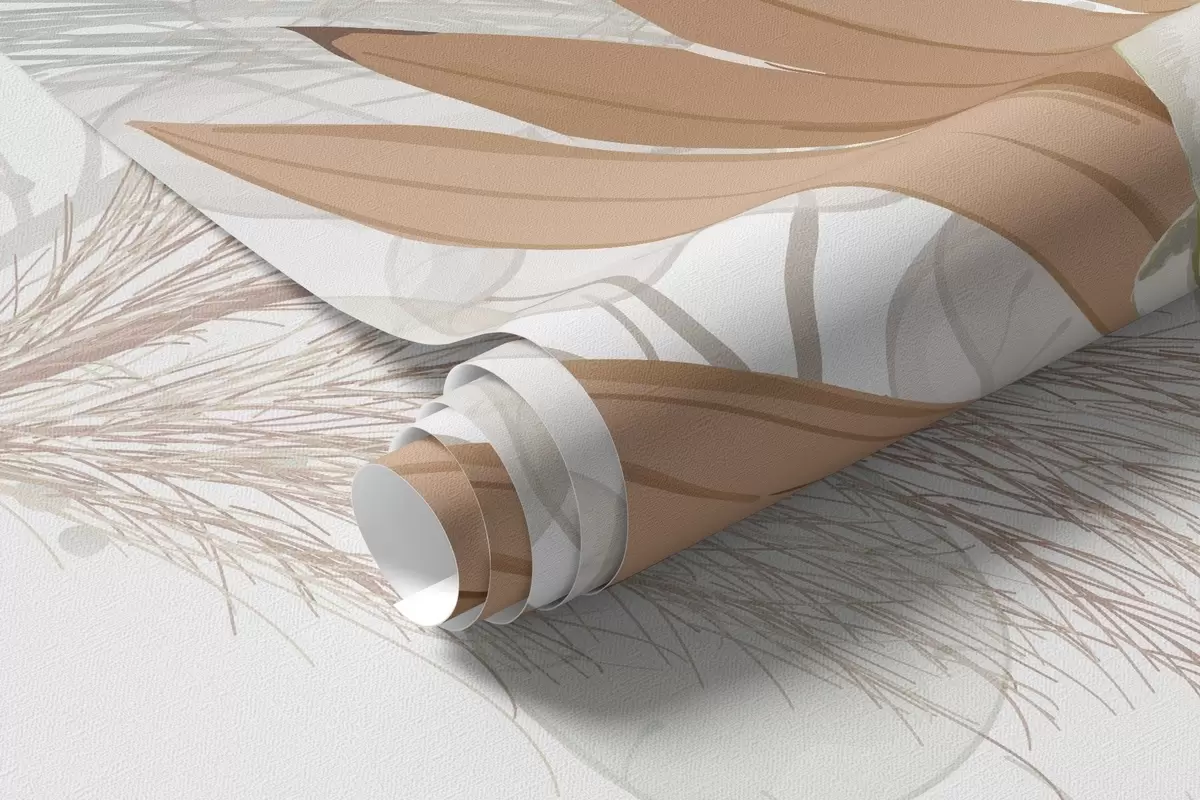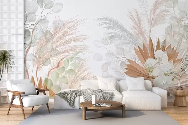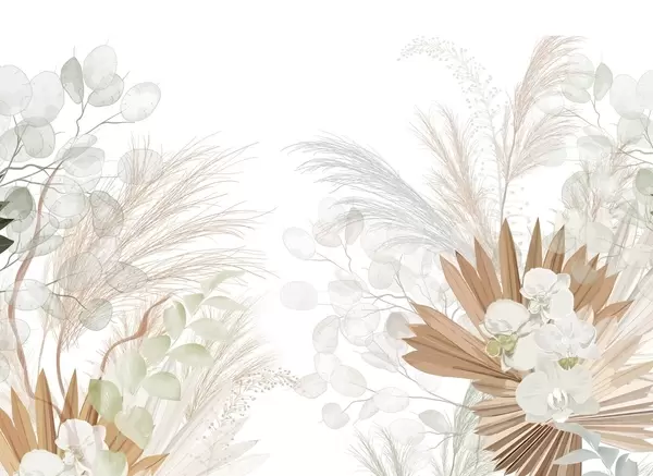 Murais de parede Capim-dos-pampas, eucalipto, folhas tropicais e orquídeas em fundo branco, cores pastel Nr. w09366