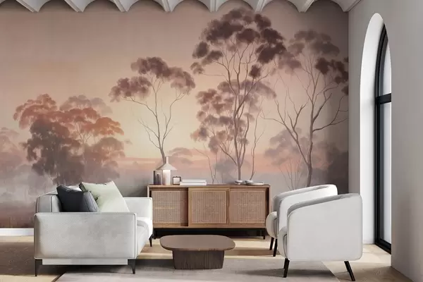 Murais de parede Uma paisagem com eucaliptos num campo com um céu cor-de-rosa pastel e laranja, uma ligeira névoa, estilo de pintura texturada Nr. w09367