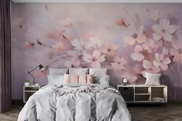 Murais de parede Um arranjo floral com flores delicadas com bordos suaves e esbatidos, sobre um fundo pastel de tons de lavanda e rosa claro Nr. w09369
