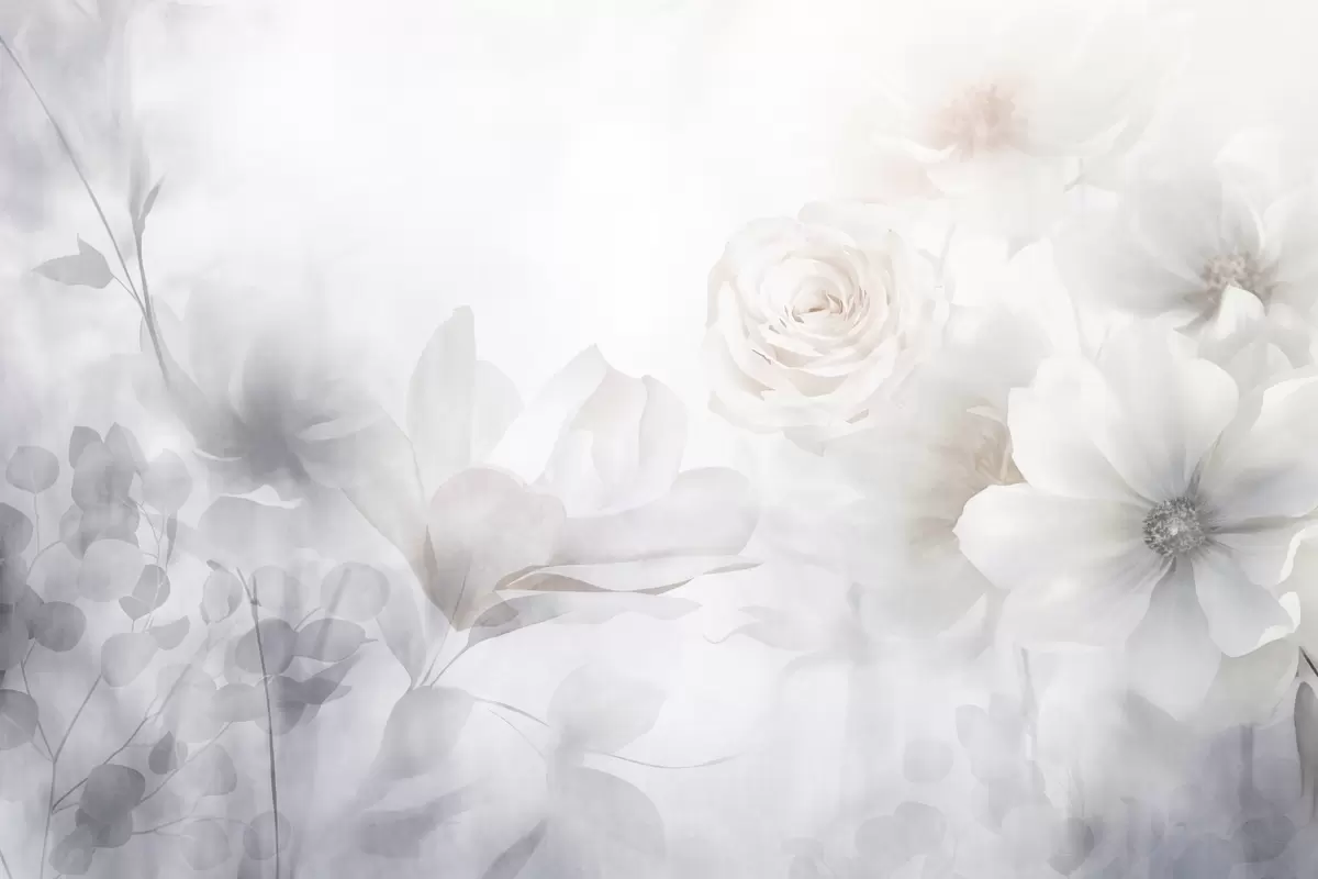 Murais de parede Um delicado arranjo floral abstrato com rosas rosa pastel e magnólias, foco suave, fundo cinzento claro Nr. w09371