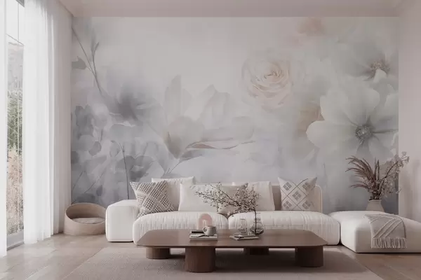 Murais de parede Um delicado arranjo floral abstrato com rosas rosa pastel e magnólias, foco suave, fundo cinzento claro Nr. w09371