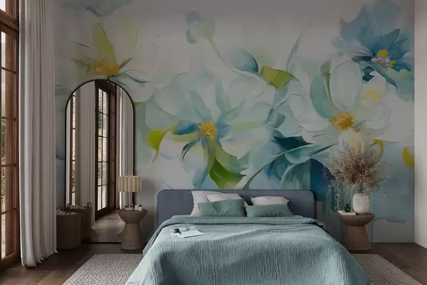 Murais de parede Flores abstractas brancas e azuis com pistilos amarelos e folhas verdes, num fundo branco, estilo de pintura texturada Nr. w09372