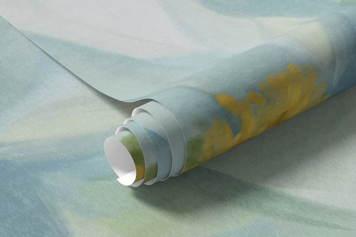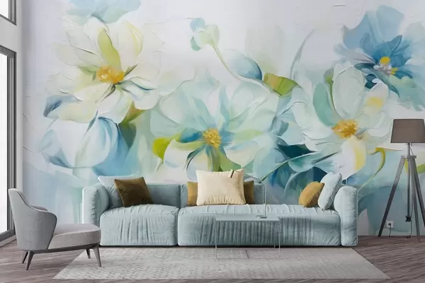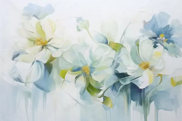 Murais de parede Flores abstractas brancas e azuis com pistilos amarelos e folhas verdes, num fundo branco, estilo de pintura texturada Nr. w09372