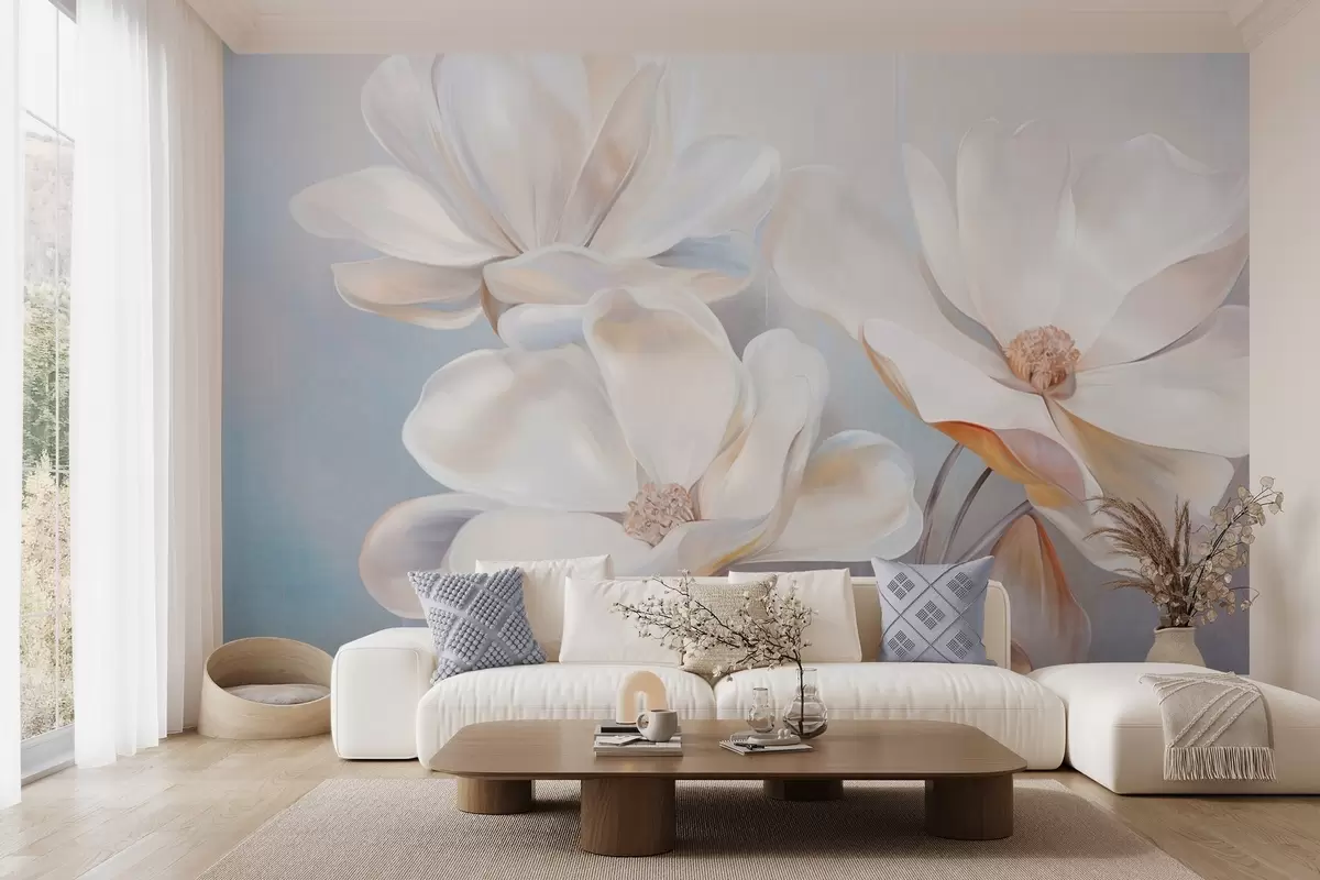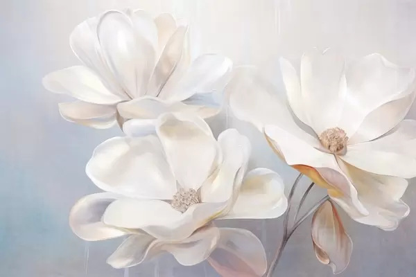 Murais de parede Flores brancas de magnólia fantasiosa com pétalas delicadas e texturadas, um fundo suave e abstrato Nr. w09373