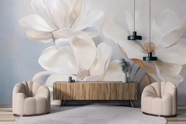 Murais de parede Flores brancas de magnólia fantasiosa com pétalas delicadas e texturadas, um fundo suave e abstrato Nr. w09373