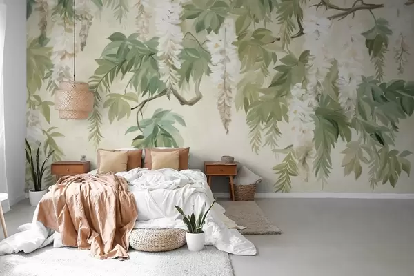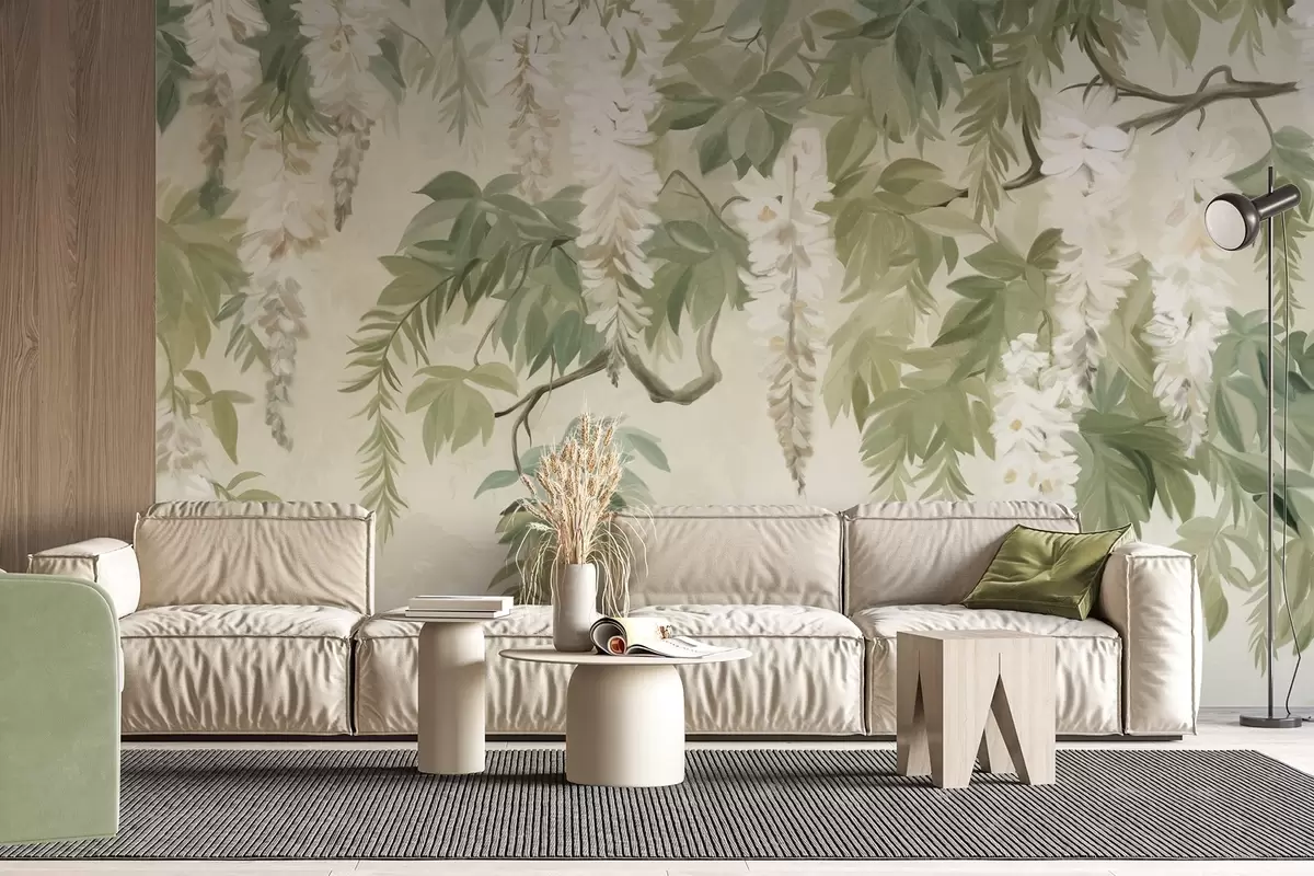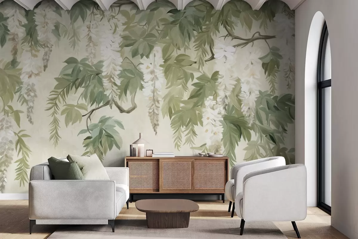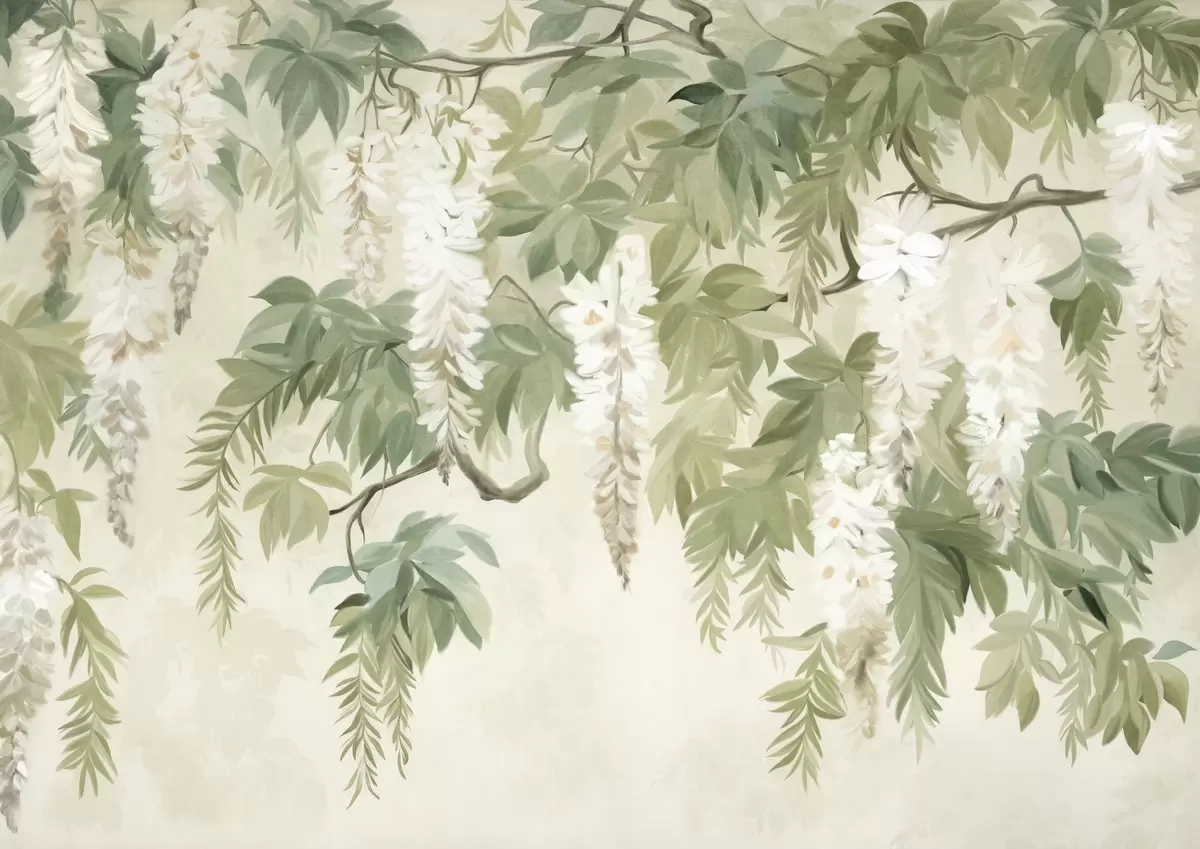 Murais de parede Ramos de glicínias com flores brancas e folhas verdes, fundo verde, estilo de pintura vintage texturada Nr. w09375