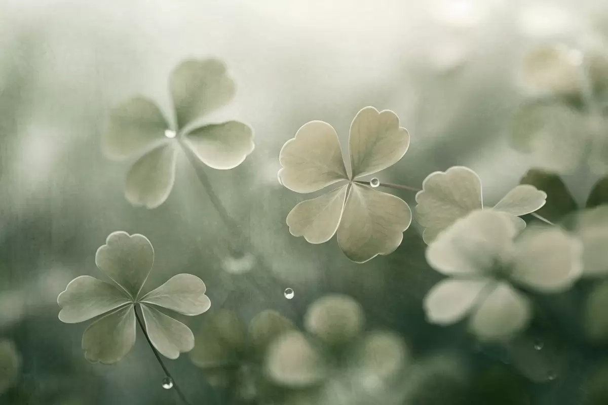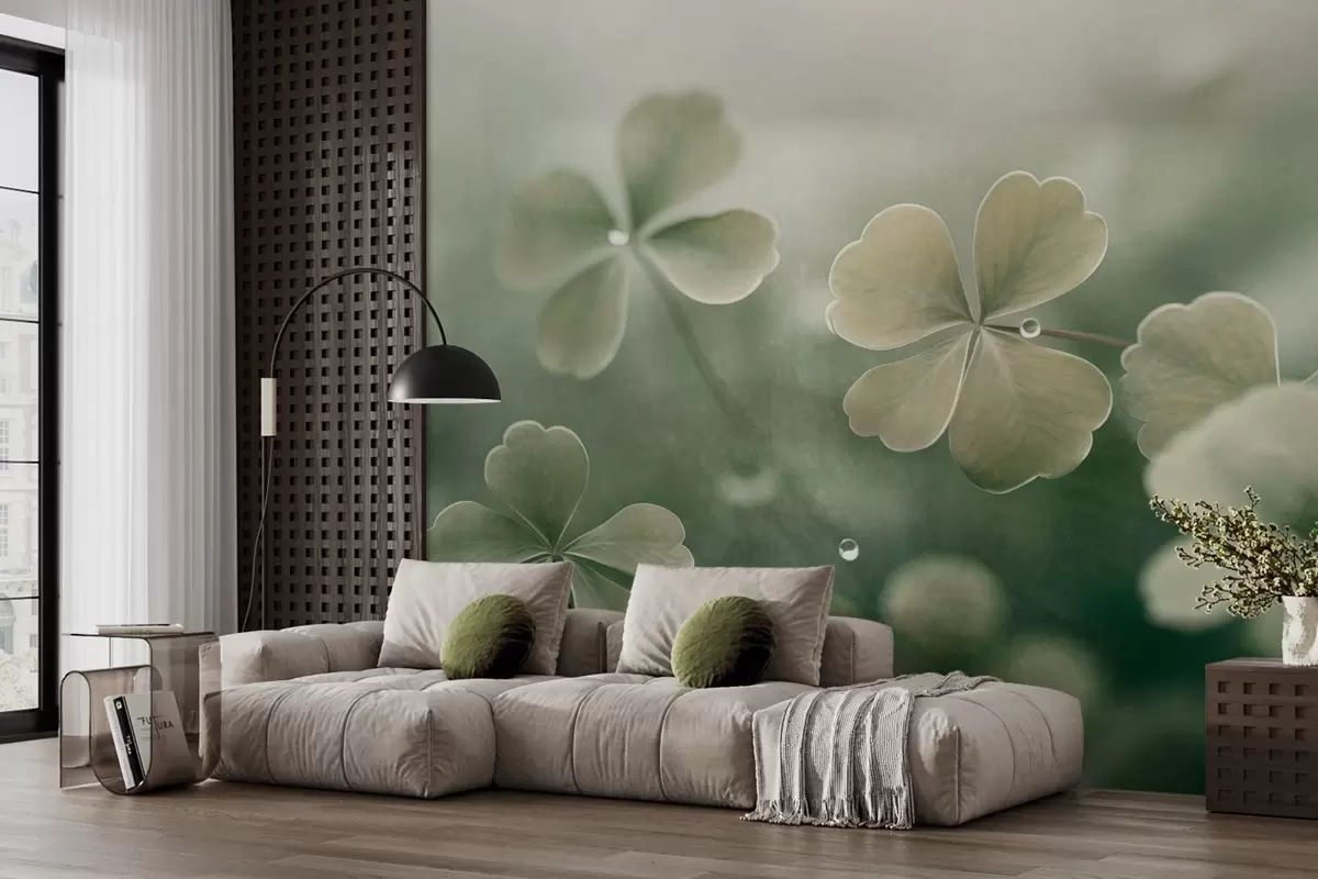 Murais de parede Trevos de quatro folhas com gotas de água, cor verde clara, focagem suave, fundo desfocado, impressão texturada Nr. w09376