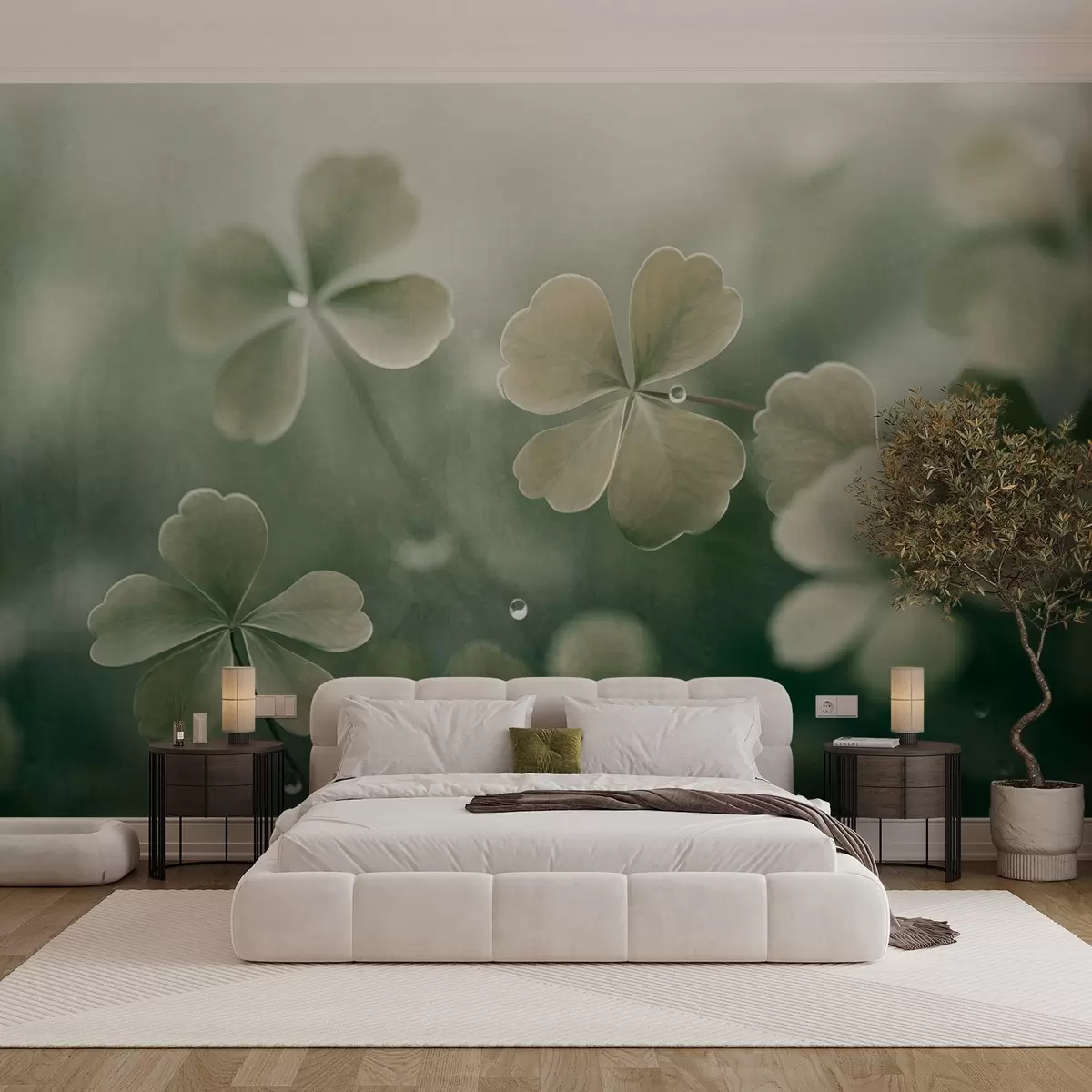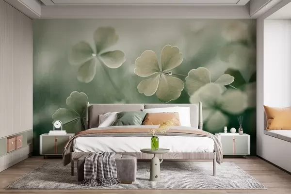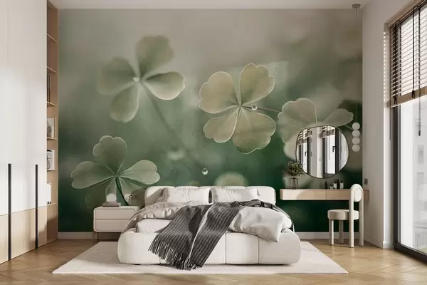 Murais de parede Trevos de quatro folhas com gotas de água, cor verde clara, focagem suave, fundo desfocado, impressão texturada Nr. w09376