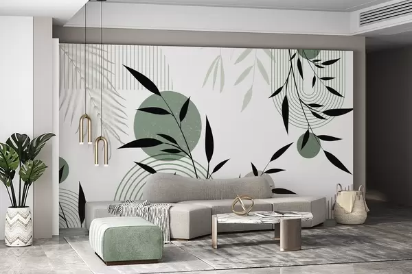 murais de parede Impressão abstrata texturada com formas geométricas, círculos e arcos e plantas pretas e verdes sobre um fundo branco w09384