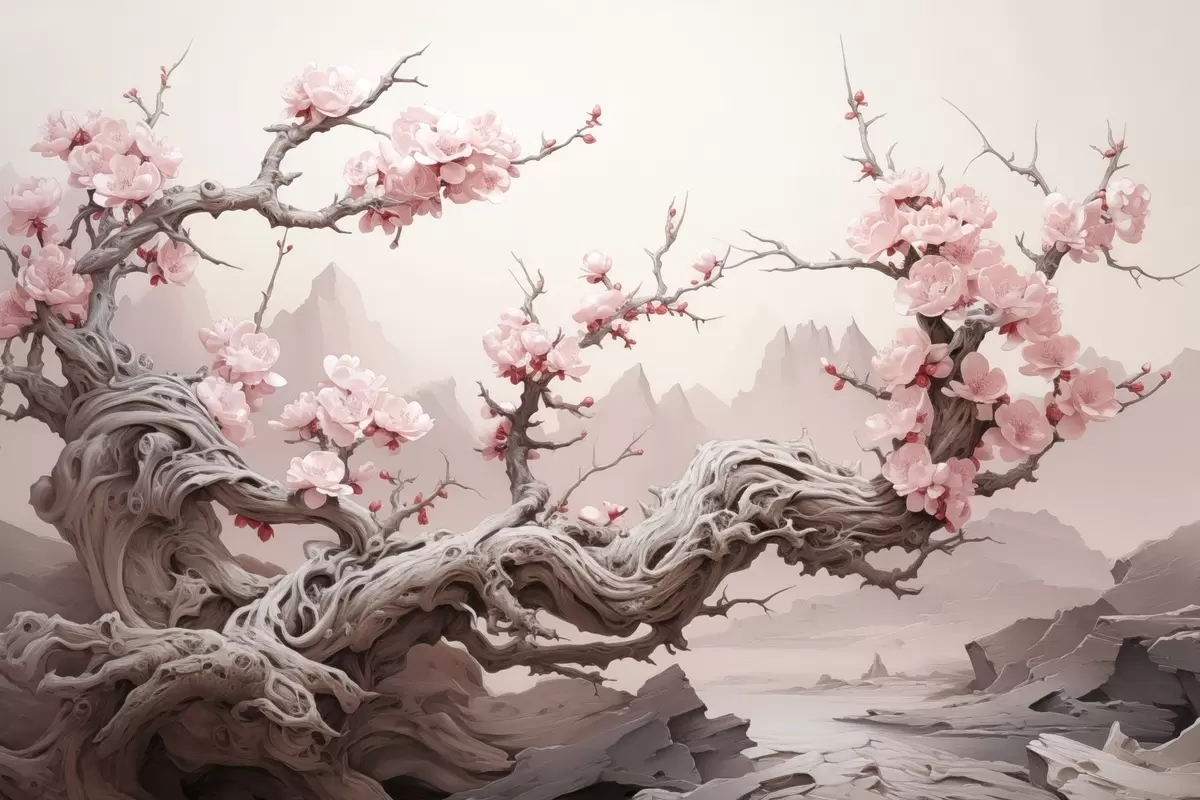 Murais de parede Tronco de árvore torcido com sakura cor-de-rosa em flor Nr. w09388