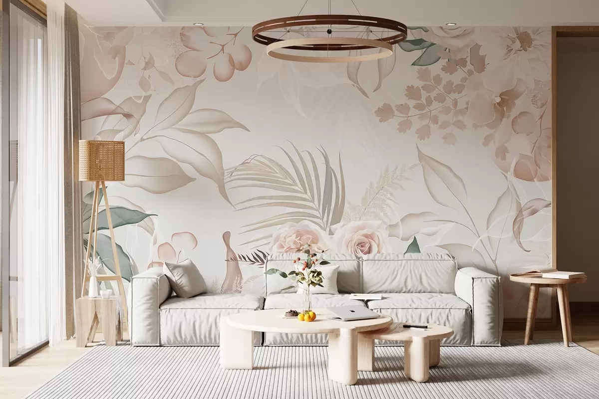 Murais de parede Arranjo floral texturizado com rosas, orquídeas, eucalipto e folhas de palmeira em tons pastel, fundo bege Nr. w09393