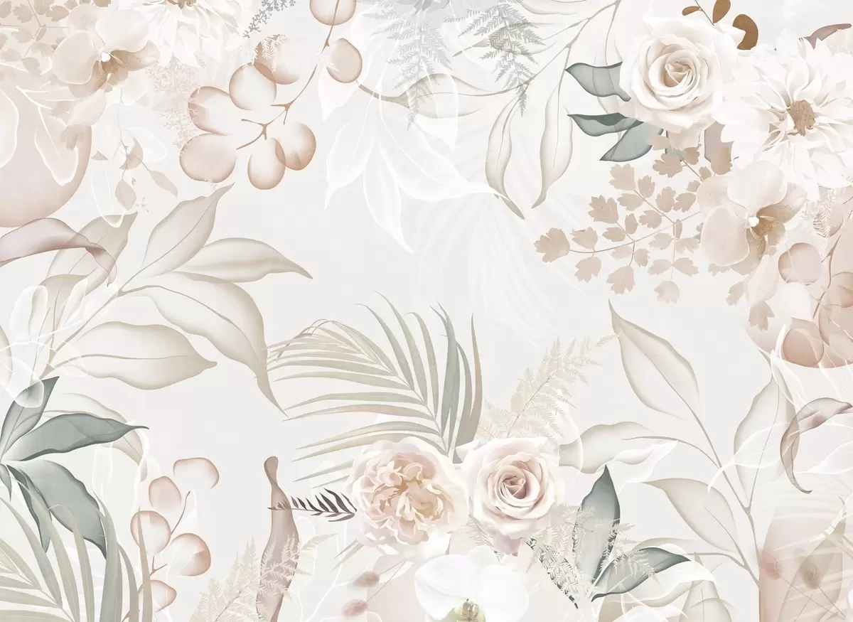 Murais de parede Arranjo floral texturizado com rosas, orquídeas, eucalipto e folhas de palmeira em tons pastel, fundo bege Nr. w09393