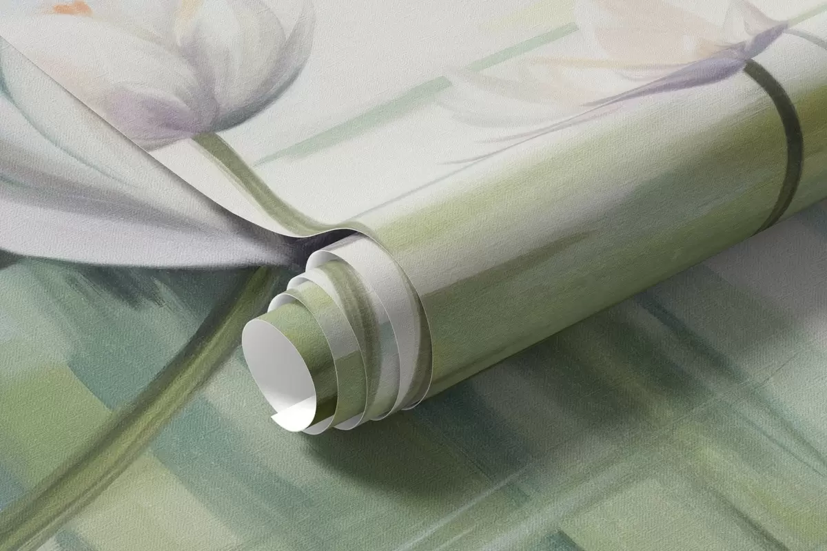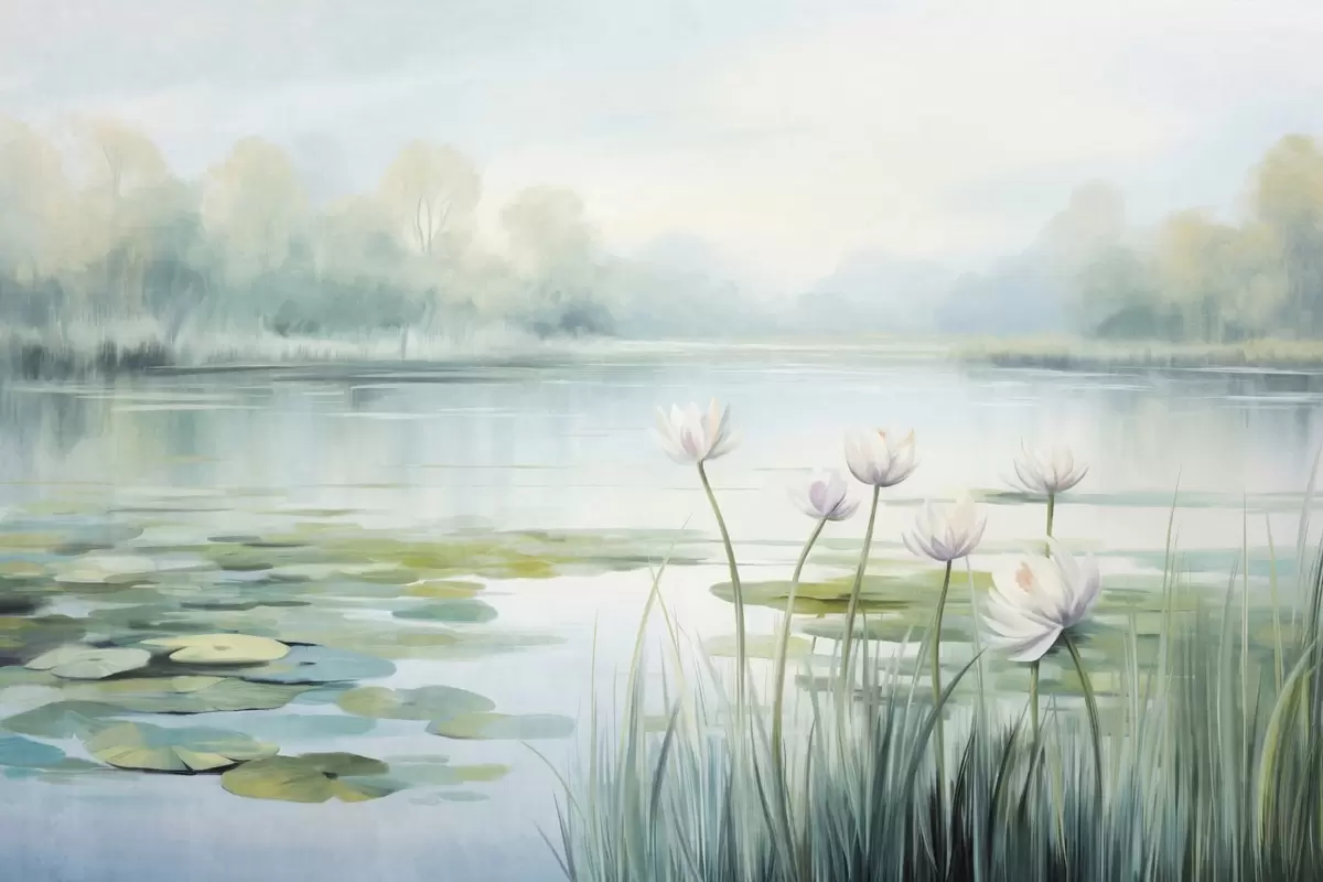 Murais de parede Paisagem com um lago, nenúfares e folhas de nenúfar, árvores ao fundo, num ambiente tranquilo, tons de azul claro e verde Nr. w09395