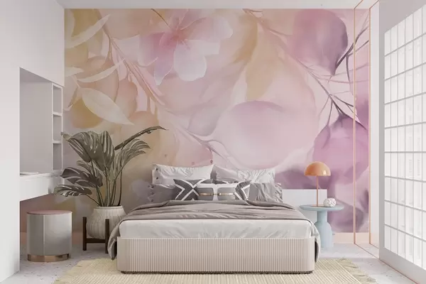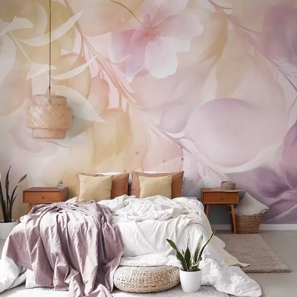 Murais de parede Arte floral com flores amarelas e roxas suaves, folhas e ramos, cores pastel suaves, efeito texturado de aguarela Nr. w09397v2