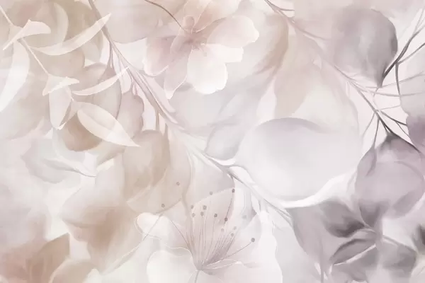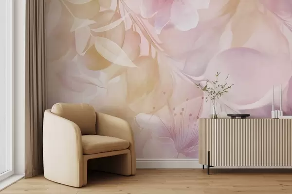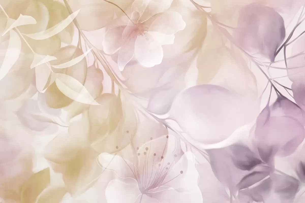 Murais de parede Arte floral com flores amarelas e roxas suaves, folhas e ramos, cores pastel suaves, efeito texturado de aguarela Nr. w09397v2