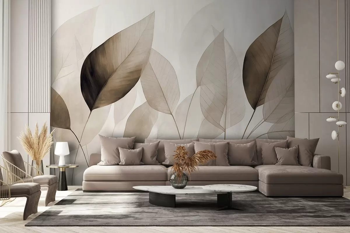 Murais de parede Pintura texturizada imitando folhas em tons de castanho e bege, com veias e caules delicados Nr. w09400v1