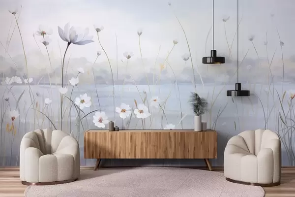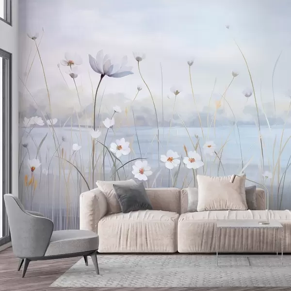 Murais de parede Flores brancas com hastes longas num campo, céu azul claro, cores suaves, textura, estilo minimalista, inspirado na natureza, fundo calmo Nr. w09401