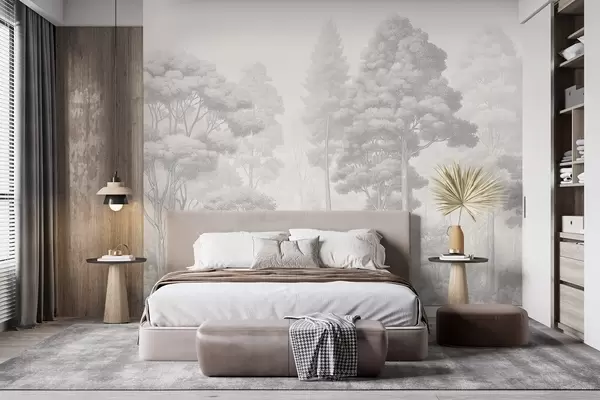 Murais de parede Paisagem florestal artística na técnica de hachura gráfica a preto e branco Nr. w09411