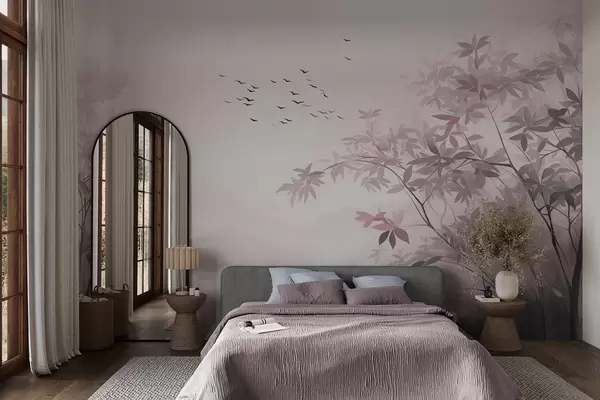 Murais de parede Paisagem texturizada com árvores e um bando de pássaros voando no céu, cores pastel, cena da natureza Nr. w09418v1