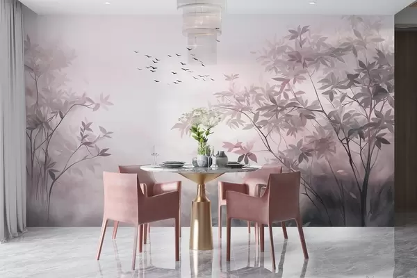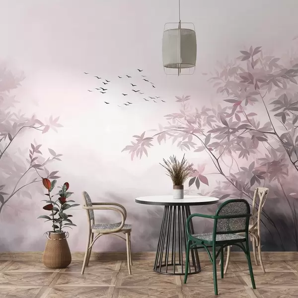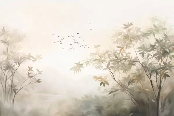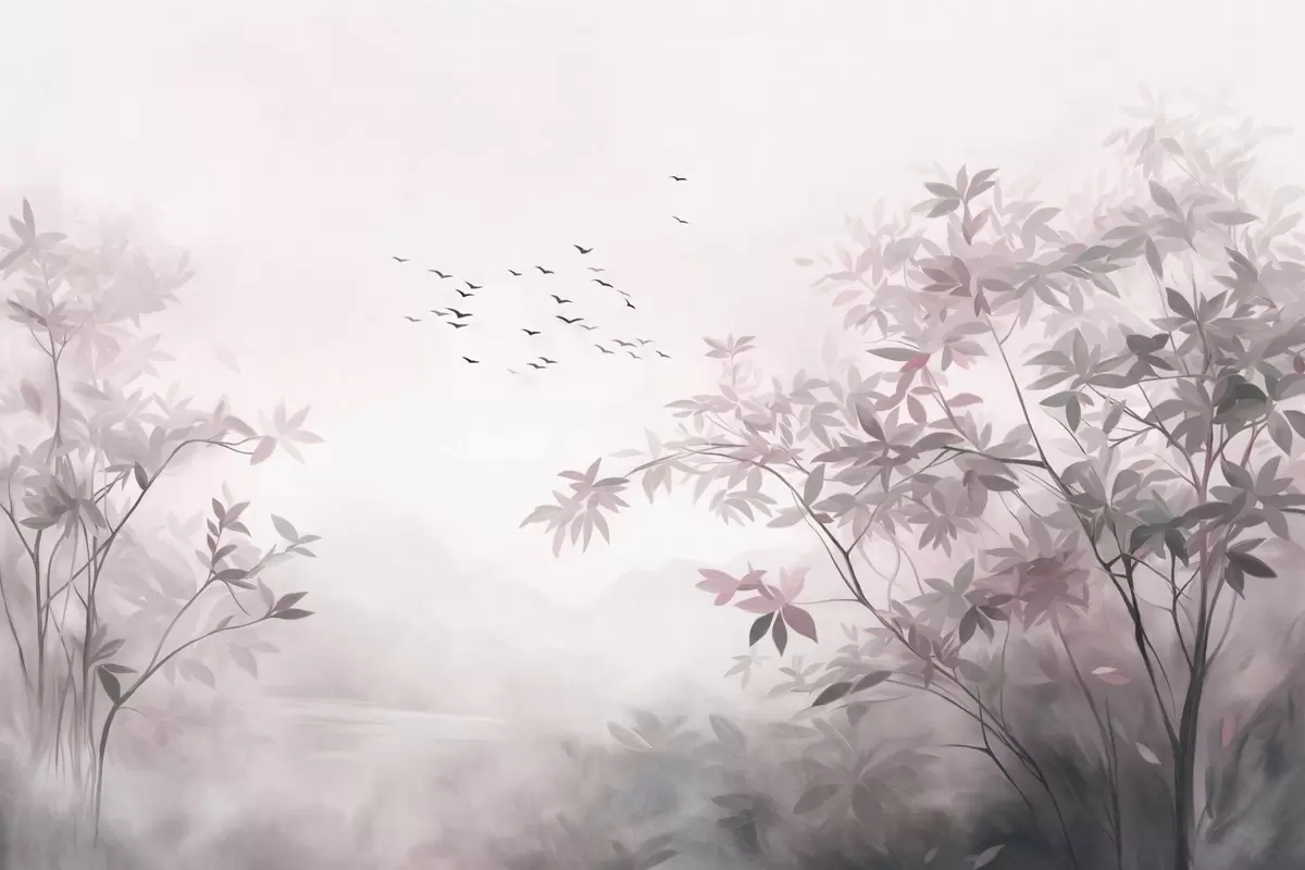 Murais de parede Paisagem texturizada com árvores e um bando de pássaros voando no céu, cores pastel, cena da natureza Nr. w09418v1