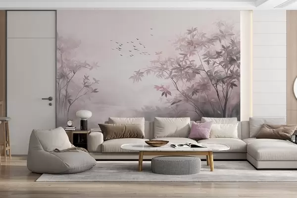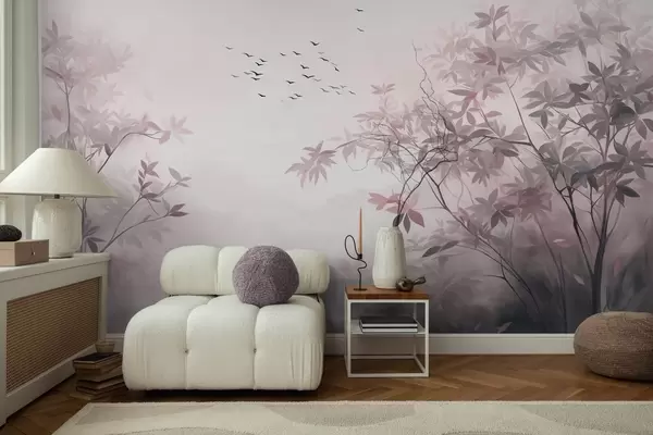 Murais de parede Paisagem texturizada com árvores e um bando de pássaros voando no céu, cores pastel, cena da natureza Nr. w09418v1