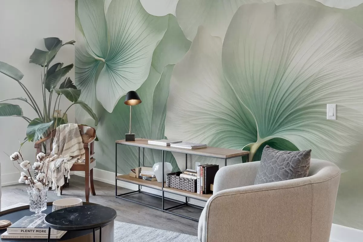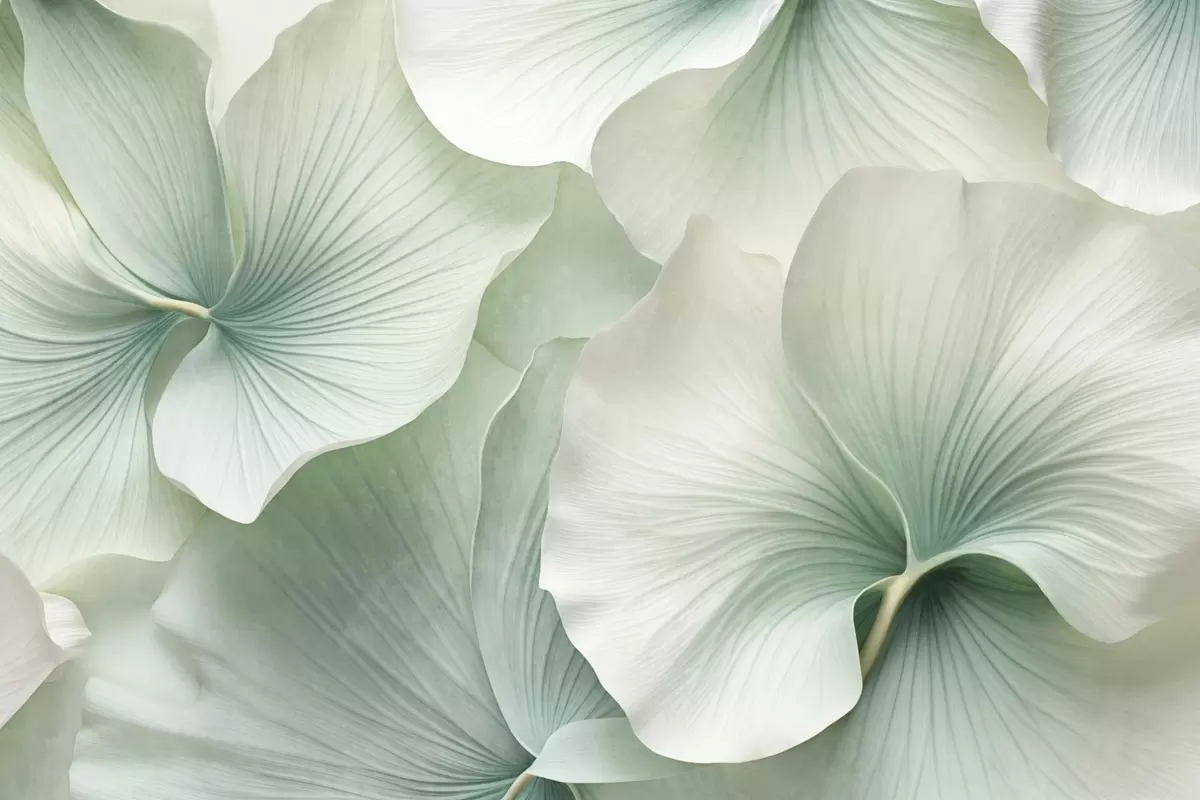 Murais de parede Folhas de ginkgo brancas e verdes, textura suave, fundo floral abstrato, estilo minimalista moderno Nr. w09421