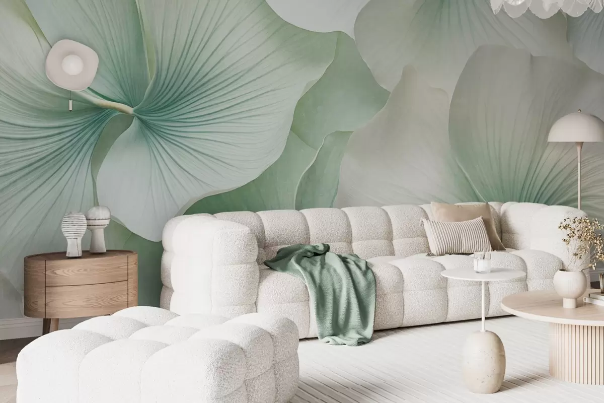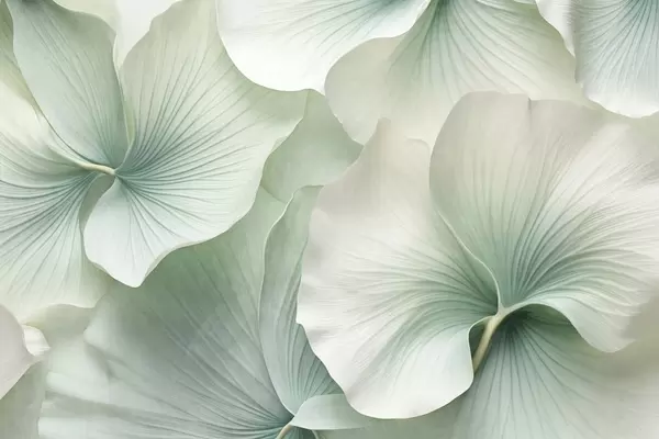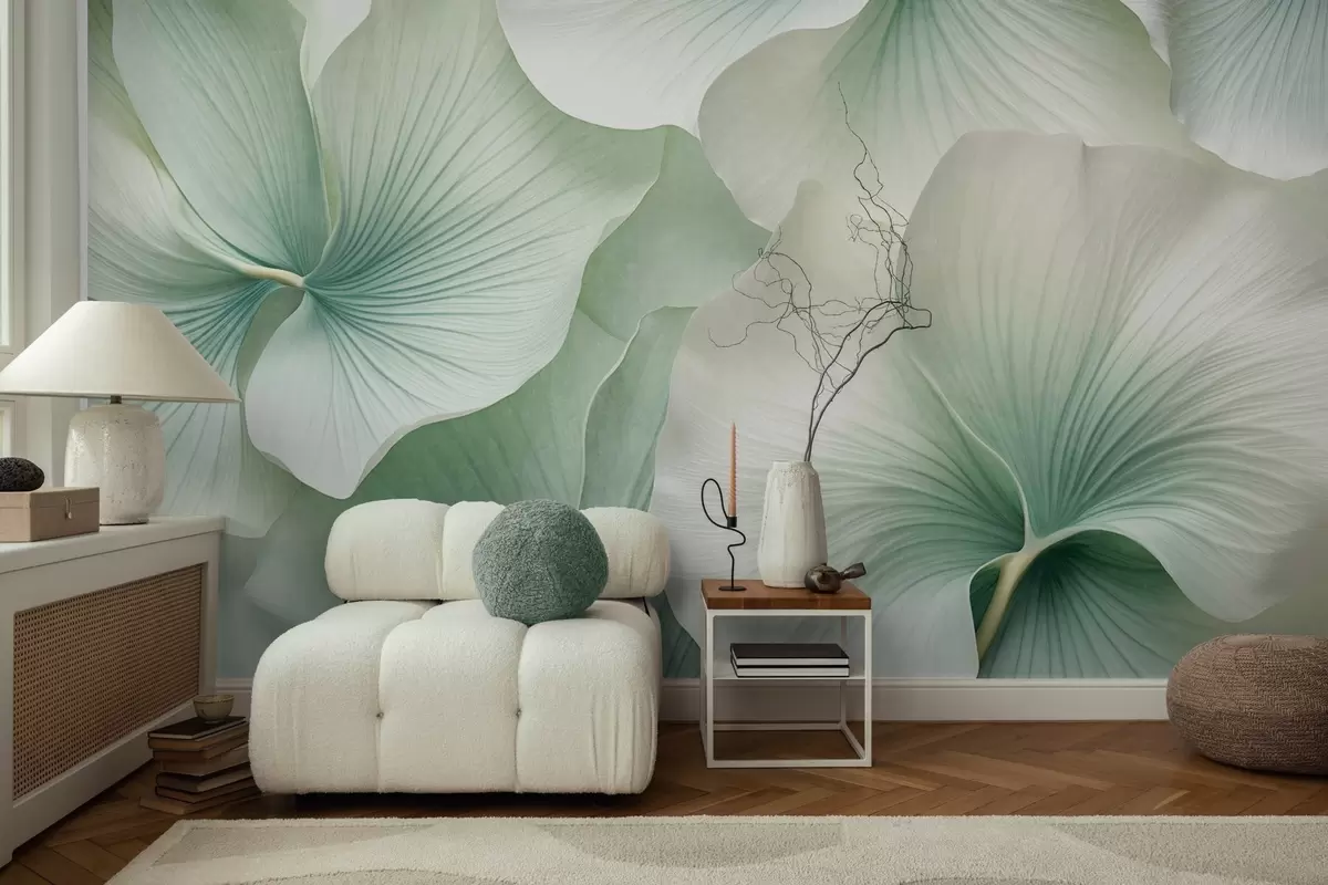 murais de parede Folhas de ginkgo brancas e verdes, textura suave, fundo floral abstrato, estilo minimalista moderno w09421