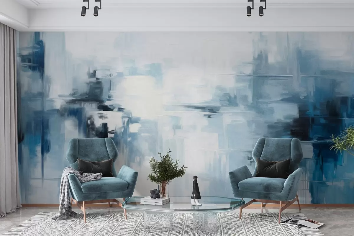 murais de parede Imitação de pintura paisagística abstrata texturizada com pinceladas azuis e brancas, estilo moderno w09422