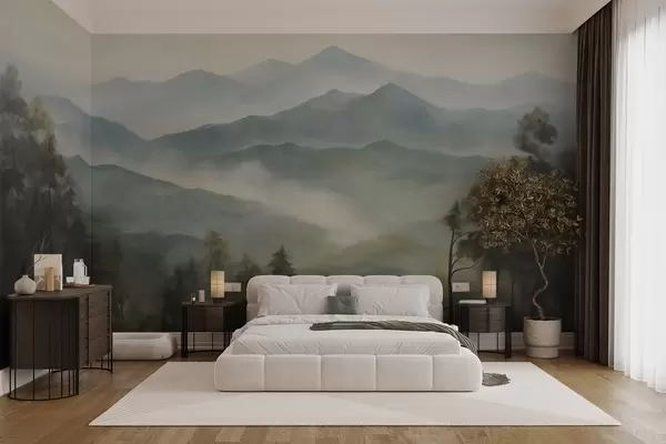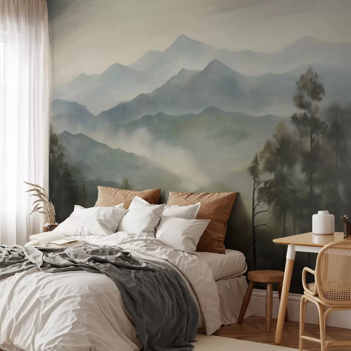 Murais de parede Cordilheira enevoada com árvores, neblina, céu nublado, cores suaves, estilo de pintura paisagística Nr. w09424