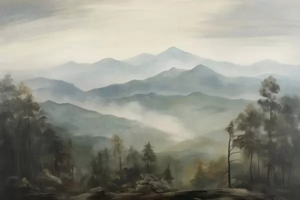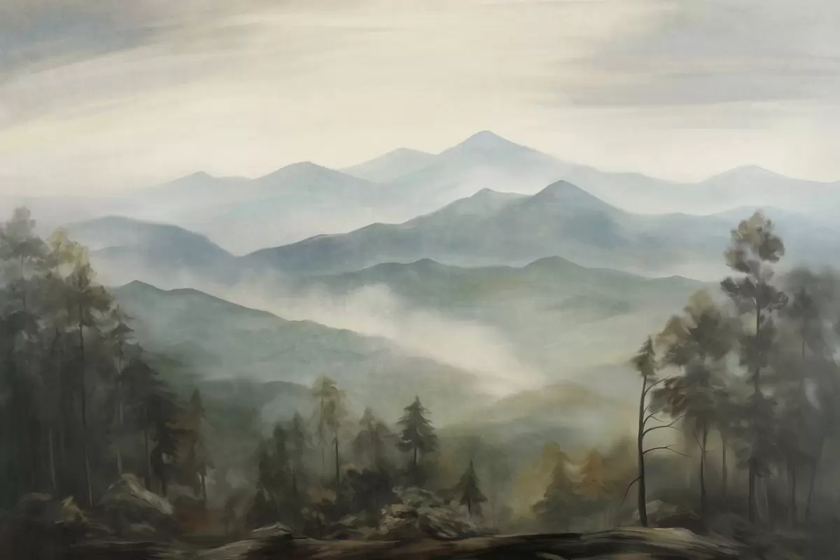 Murais de parede Cordilheira enevoada com árvores, neblina, céu nublado, cores suaves, estilo de pintura paisagística Nr. w09424