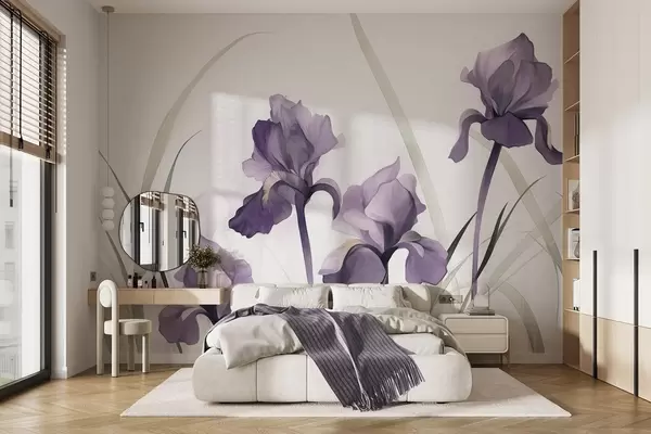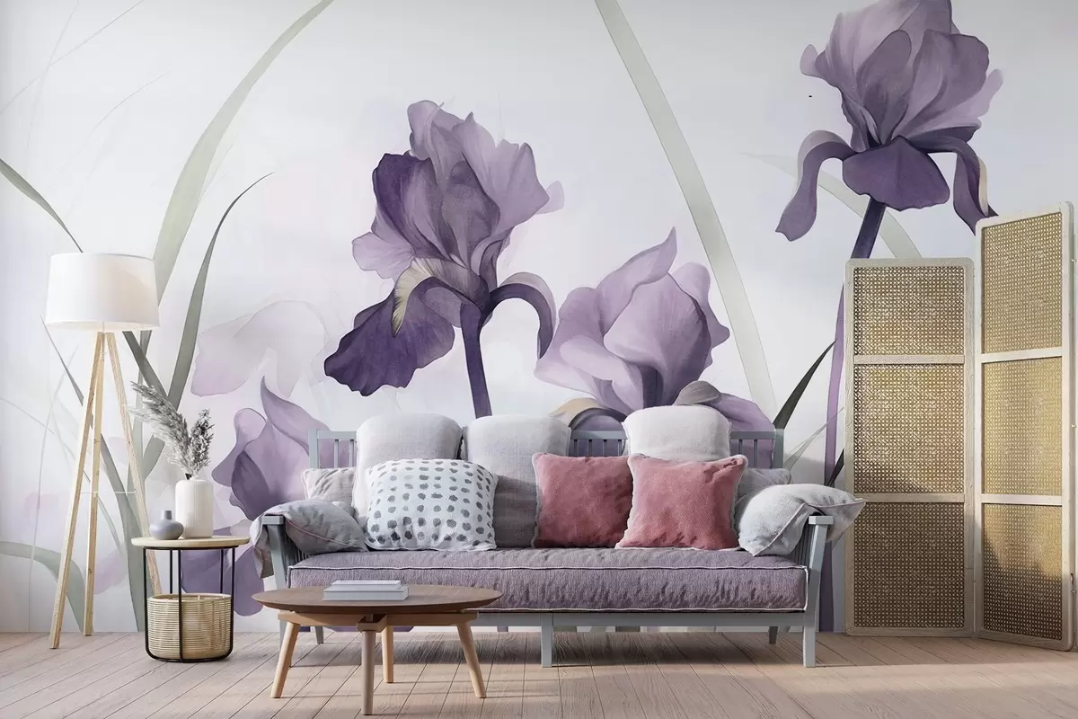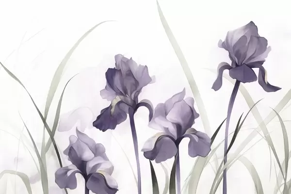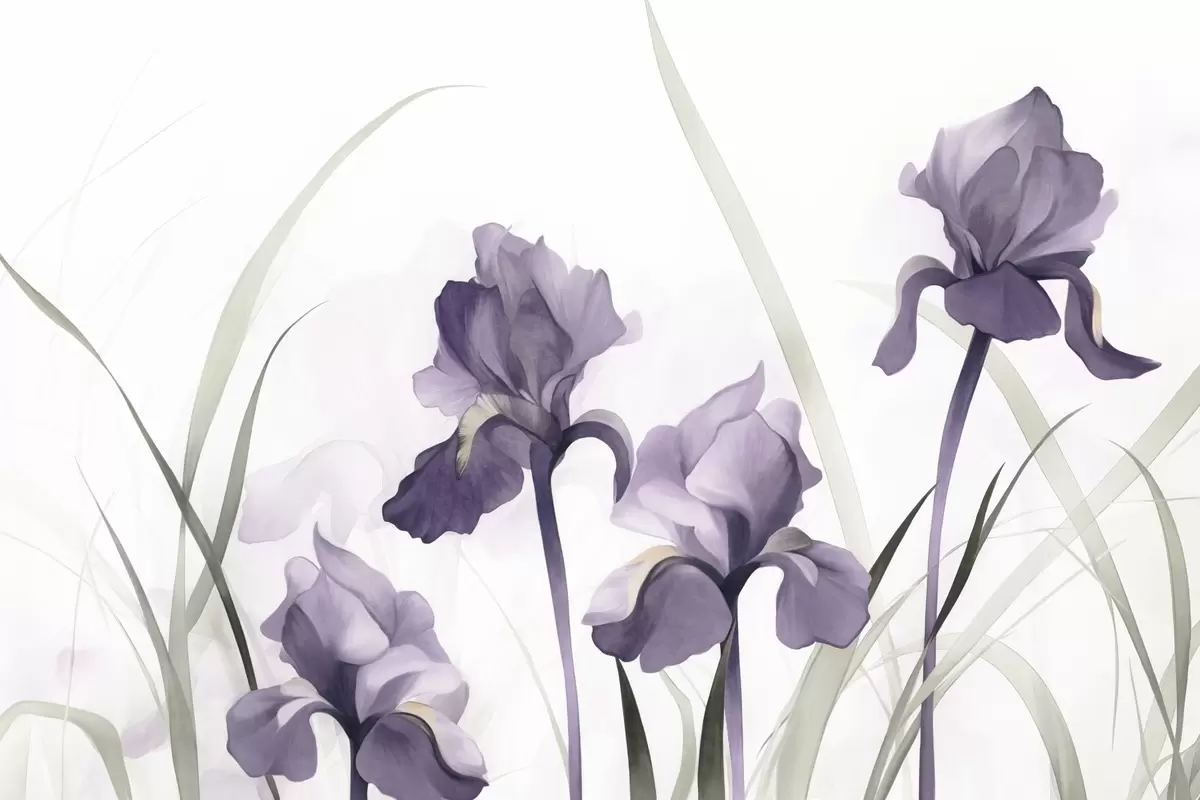 Murais de parede Flores de íris roxas com caules verdes, estilo pintura em aquarela, fundo branco, cores suaves, elegante, artístico Nr. w09425