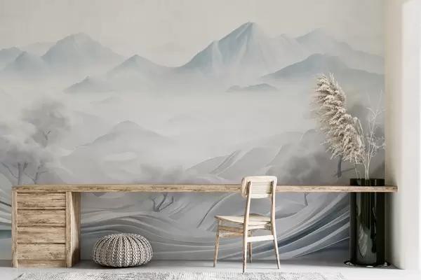 Murais de parede Paisagem montanhosa decorativa abstrata com neve, árvores brancas e neblina, estilo minimalista texturizado Nr. w09426