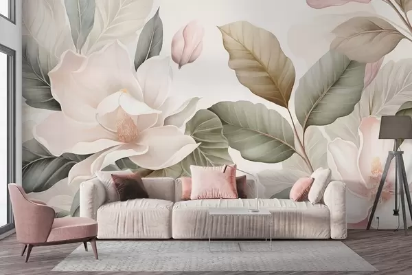 Murais de parede Flores de magnólia com folhas em tons pastel, branco, rosa e verde, suaves, delicadas, estilo aquarela Nr. w09427