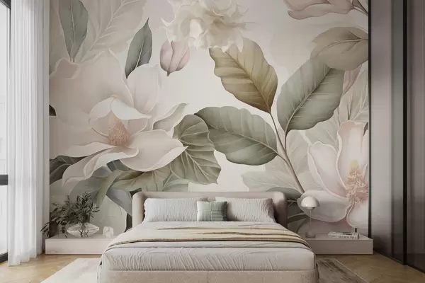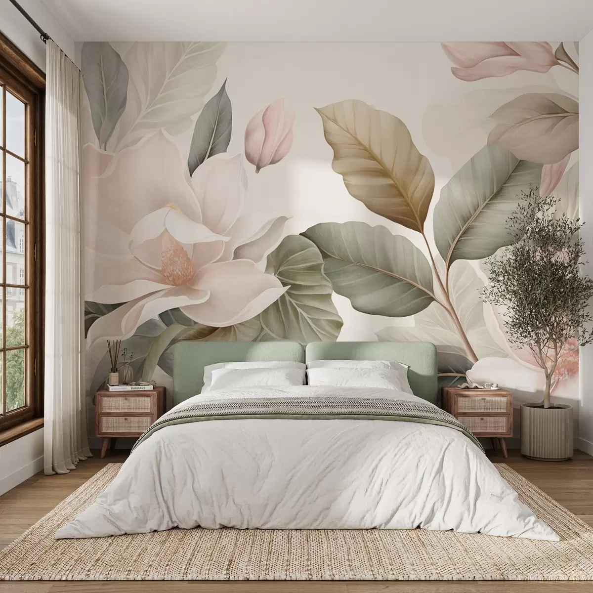Murais de parede Flores de magnólia com folhas em tons pastel, branco, rosa e verde, suaves, delicadas, estilo aquarela Nr. w09427