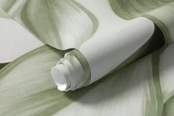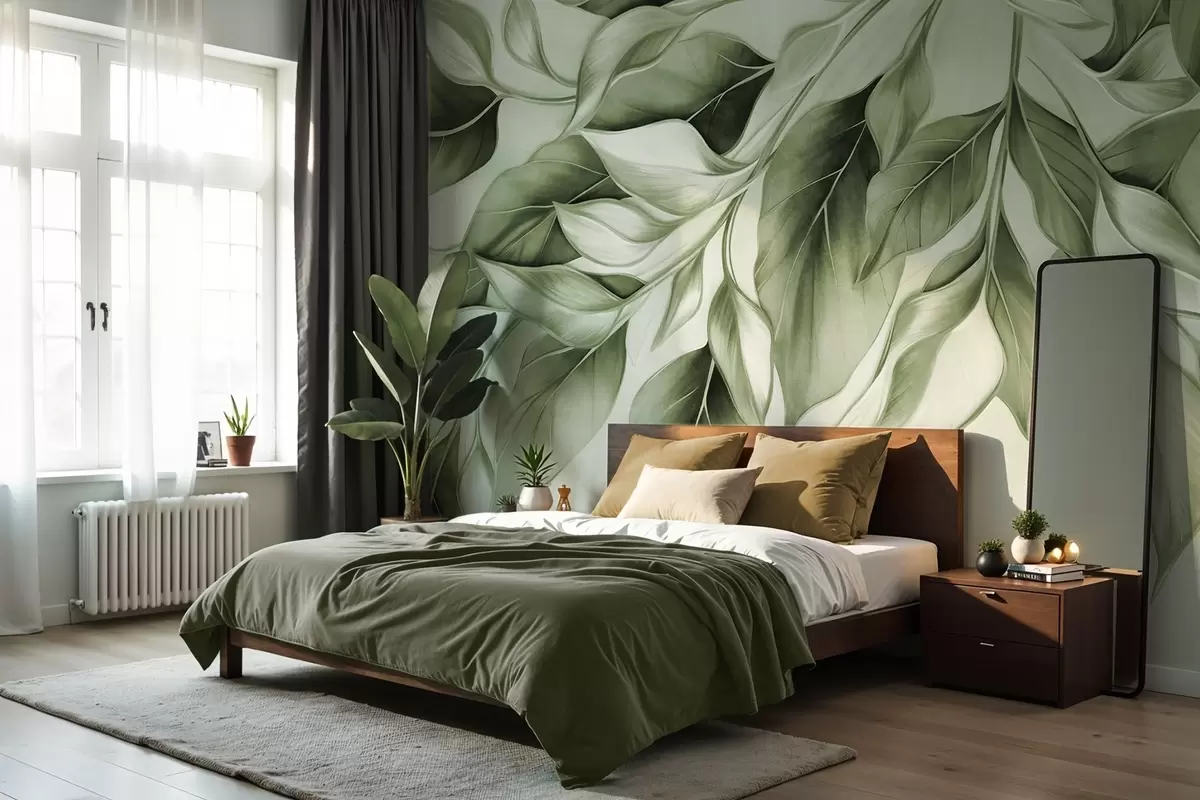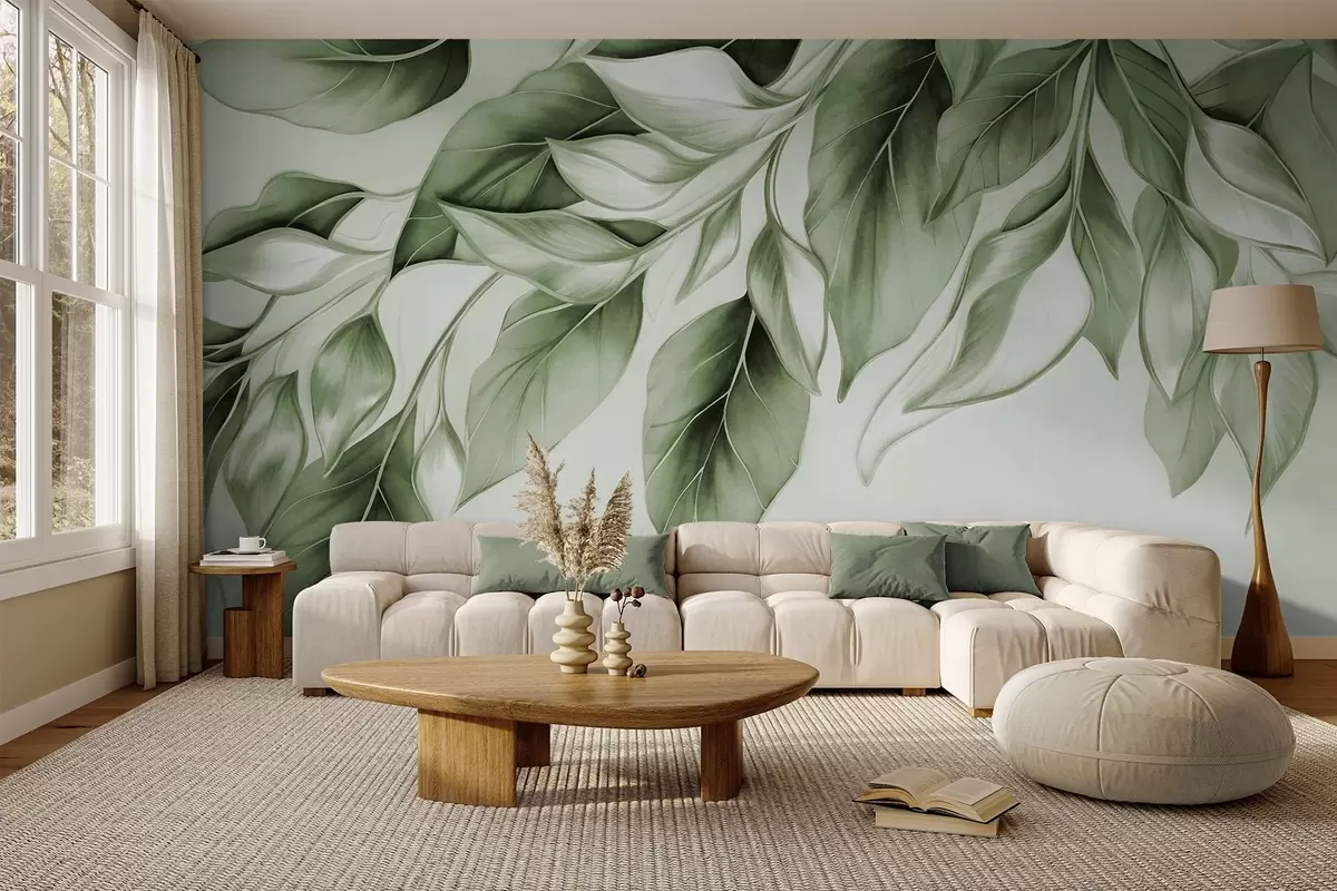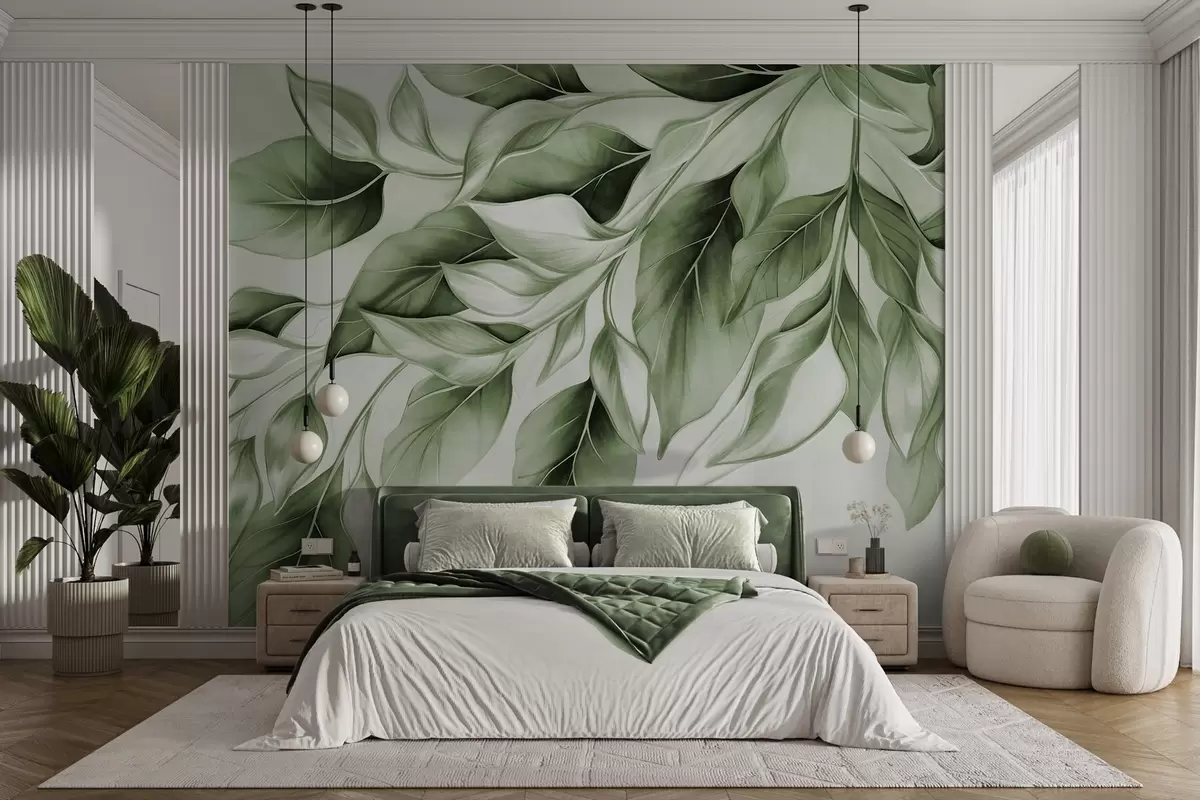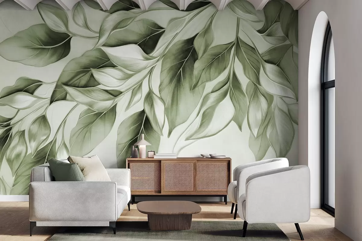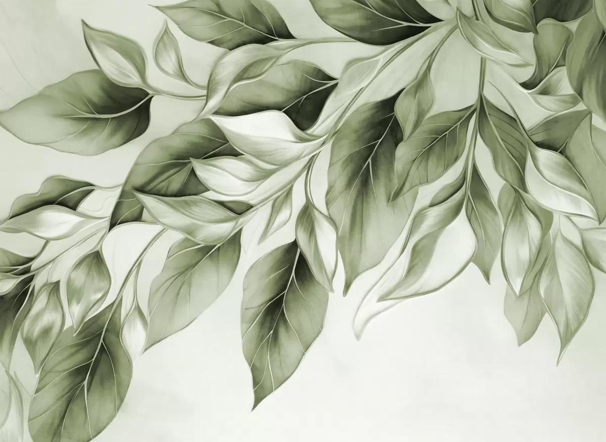 Murais de parede Folhas verdes texturizadas e suaves, fundo claro, design elegante e artístico, estilo moderno Nr. w09429v1
