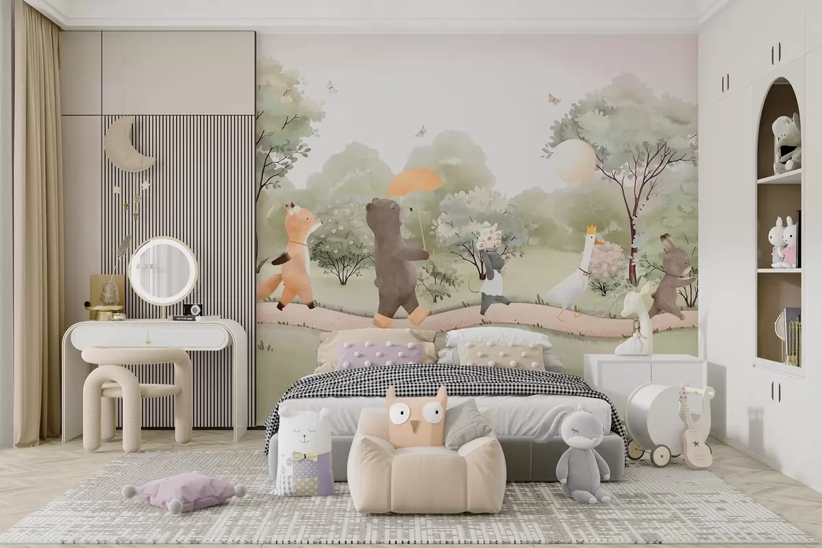 Murais de parede Viagem festiva de pequenos animais pela floresta em estilo aquarela Nr. w09440