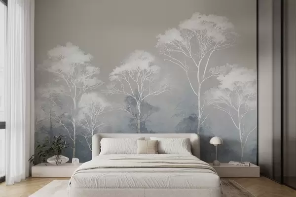 Murais de parede Árvores minimalistas em tons de azul-acinzentado, no nevoeiro Nr. w09448
