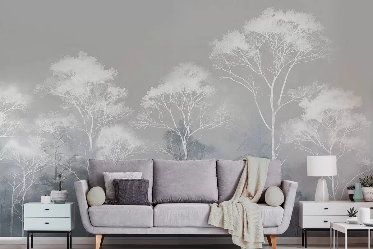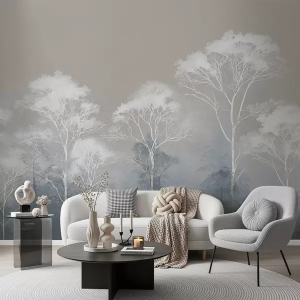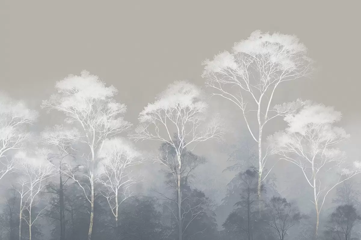 murais de parede Árvores minimalistas em tons de azul-acinzentado, no nevoeiro w09448