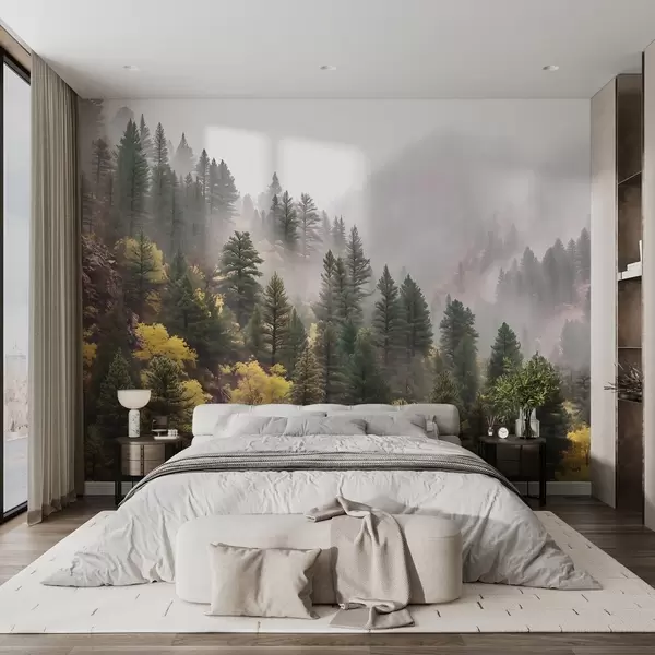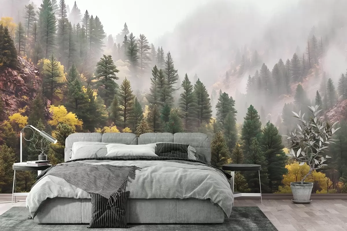 Murais de parede Floresta de pinheiros enevoada e atmosférica nas montanhas Nr. w09463