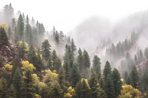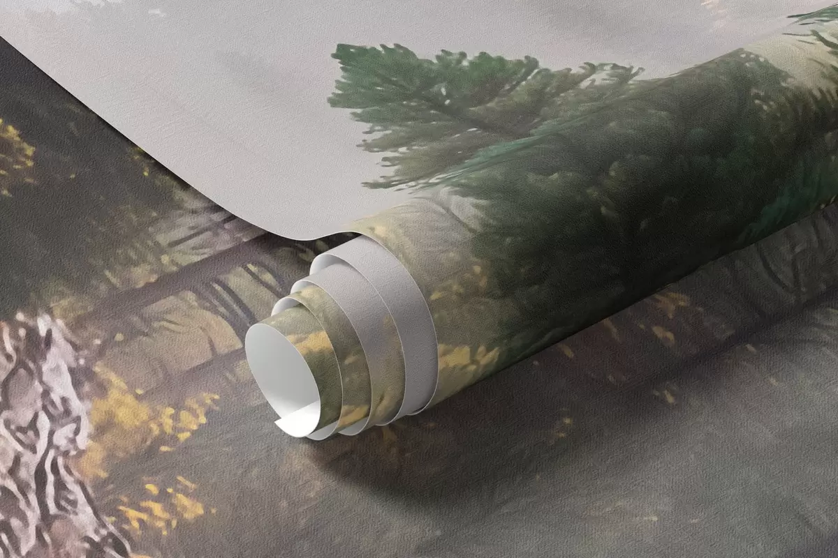 Murais de parede Floresta de pinheiros enevoada e atmosférica nas montanhas Nr. w09463