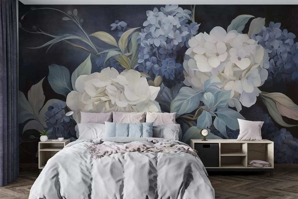 Murais de parede Pintura texturizada em azul escuro imitando flores de hortênsias com folhas grandes, fundo abstrato e escuro Nr. w09465v1