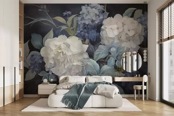 Murais de parede Pintura texturizada em azul escuro imitando flores de hortênsias com folhas grandes, fundo abstrato e escuro Nr. w09465v1