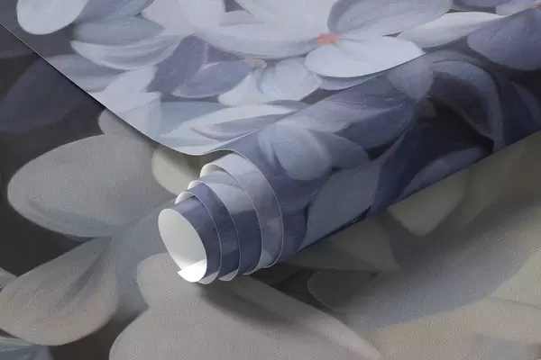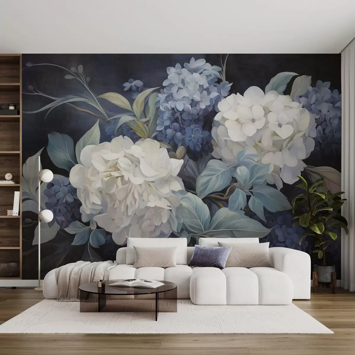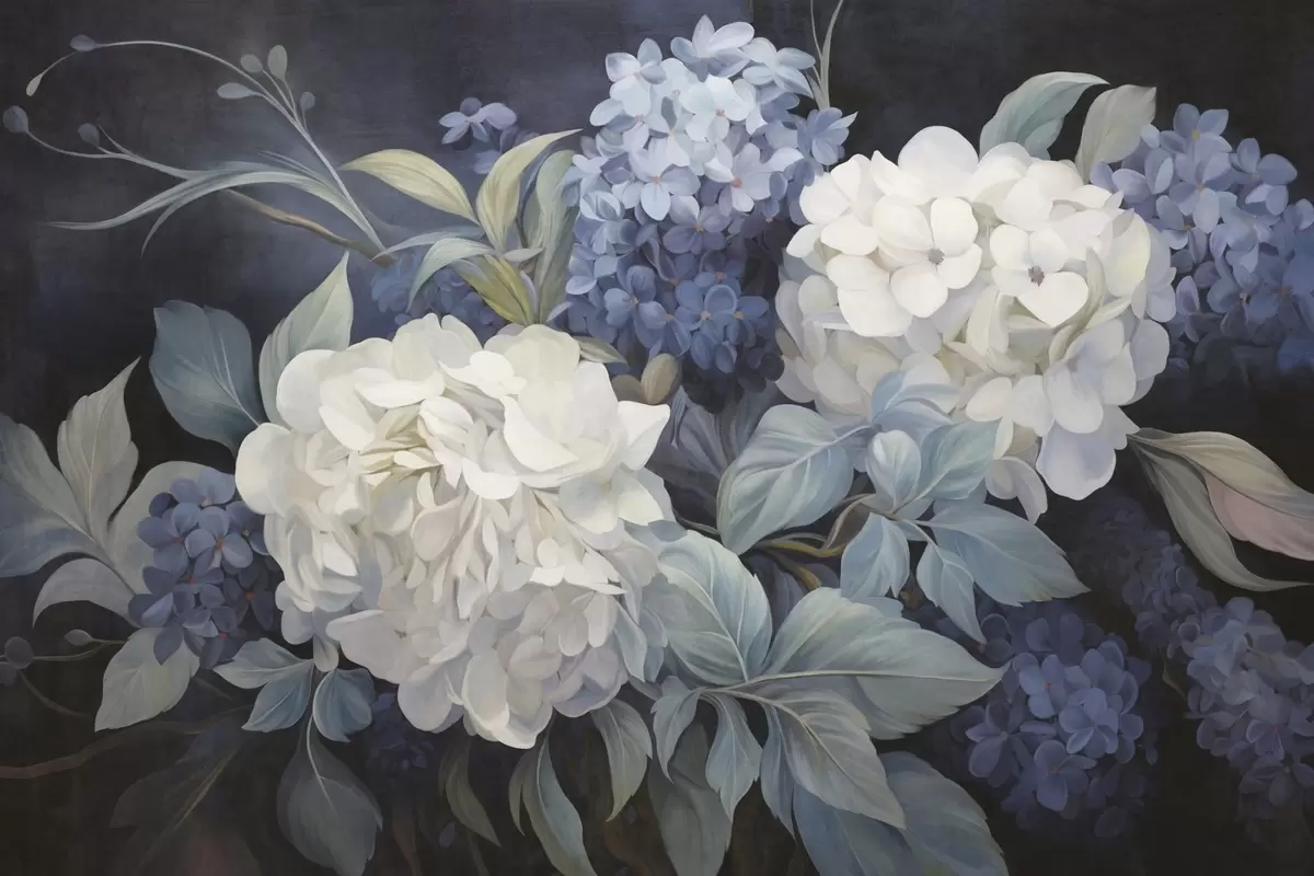 Murais de parede Pintura texturizada em azul escuro imitando flores de hortênsias com folhas grandes, fundo abstrato e escuro Nr. w09465v1