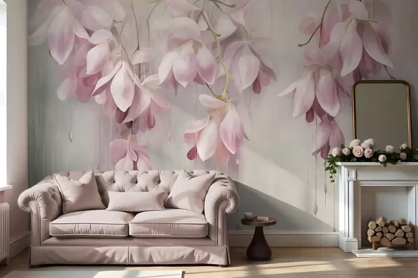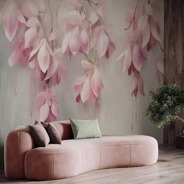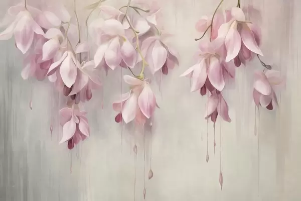 Murais de parede Flores cor-de-rosa pendentes, fundo cinza claro, arranjo floral texturizado, arte botânica, cores pastel Nr. w09471