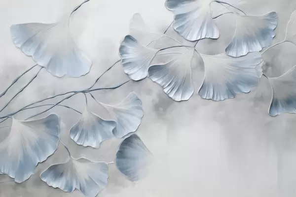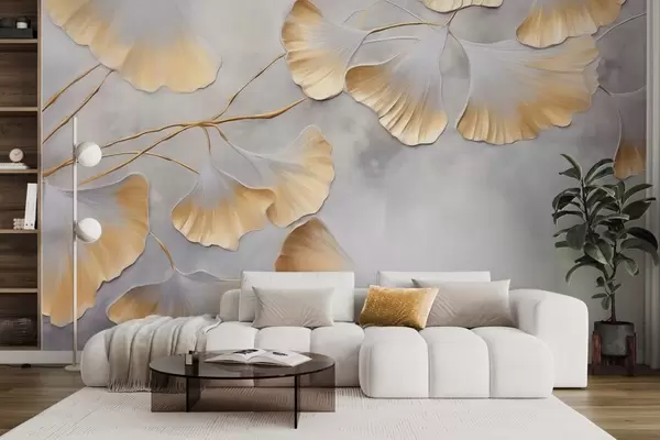 Murais de parede Folhas de ginkgo biloba com bordas amarelas num ramo, fundo cinzento texturizado, design elegante e minimalista Nr. w09472