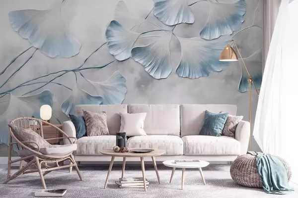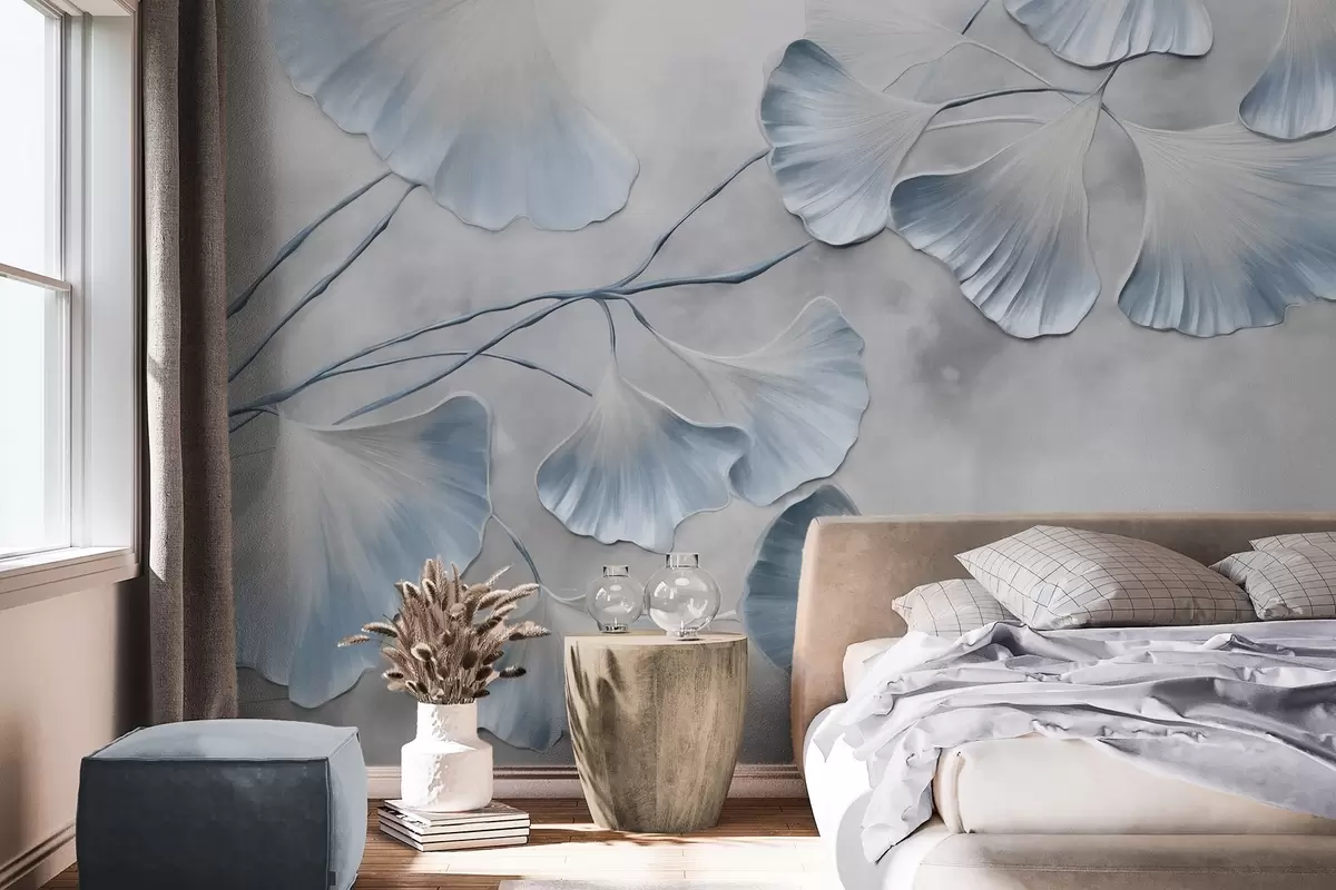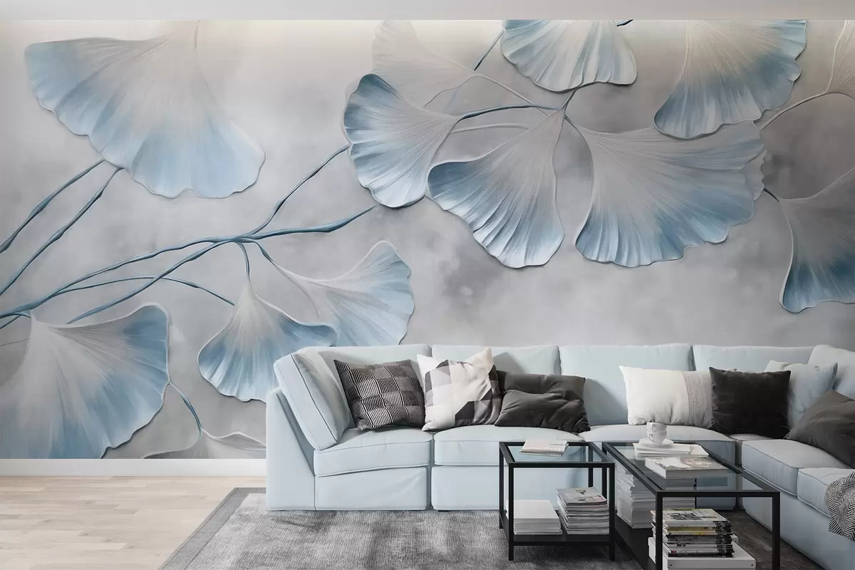 murais de parede Folhas de ginkgo biloba com bordas azuis num ramo, fundo cinzento texturizado, design elegante e minimalista w09472v1