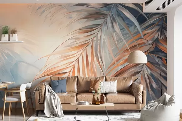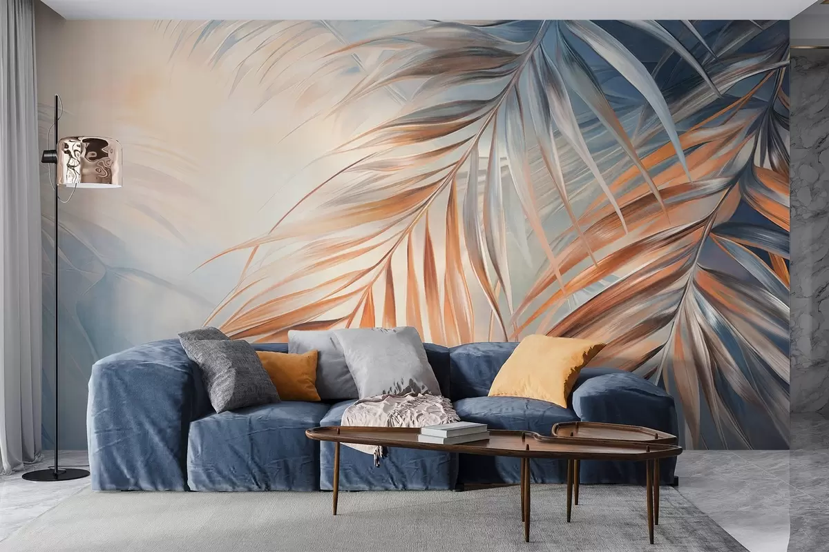 Murais de parede Folhas de palmeira com tons de laranja e azul, fundo com textura clara e cores suaves, estilo tropical elegante Nr. w09475